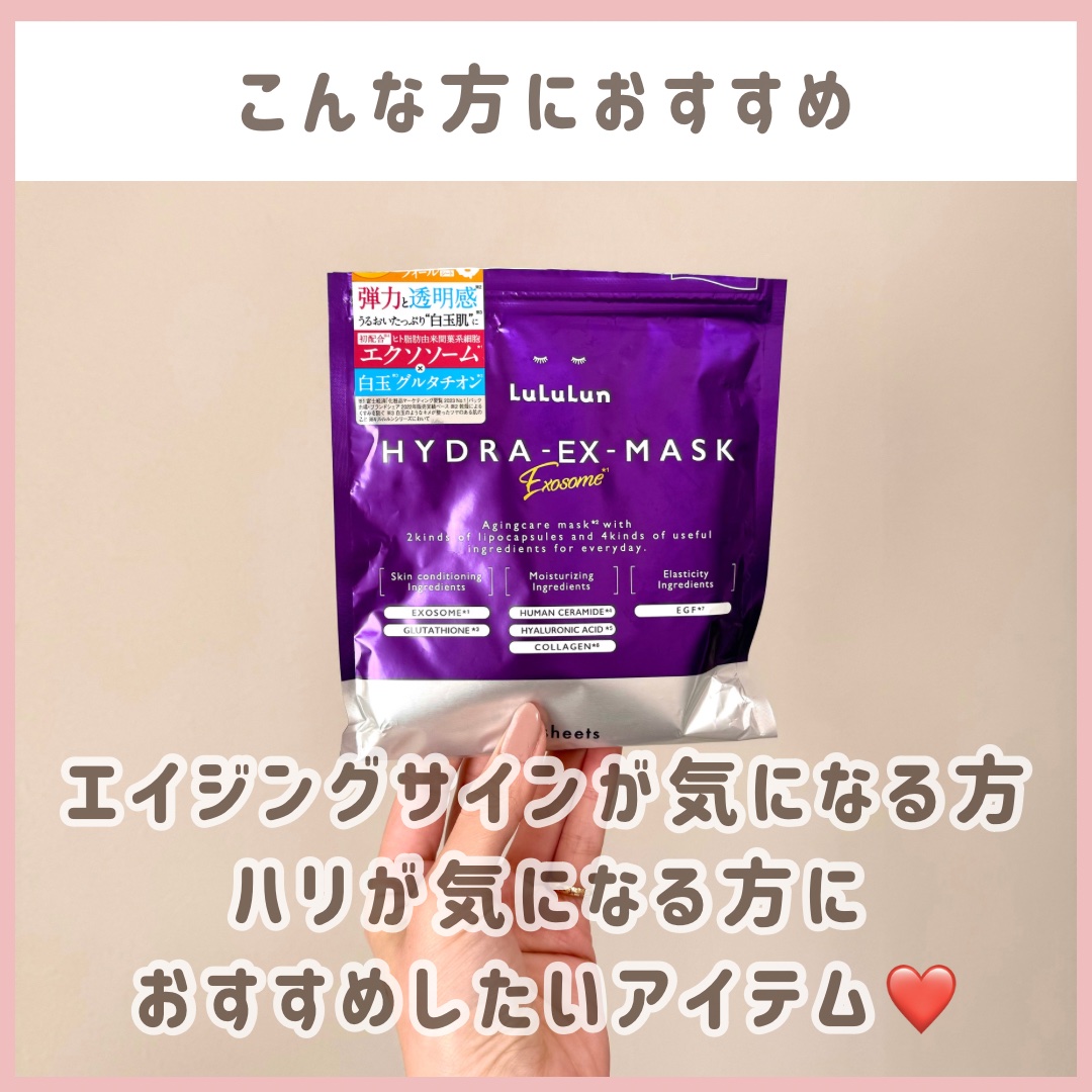 - ルルルンハイドラシリーズから新登場。うるおいにプラスするのは、「エクソソーム*1」。先端再生テクノロジーにインスパイアされた、デイリーエイジングケア※1マスクです。白玉※2グルタチオン*2をプラス配合し、弾力・透明感※3・つやめきのあるなめらかなお肌へ導きます。 (*1 整肌成分 ヒト脂肪由来間葉系細胞エクソソーム *2 整肌成分 グルタチオン、アルブチン、レシチン ※1 年齢に応じて肌へうるおいと弾力を与えるケアのこと ※2 白玉のようなキメが整ったツヤのある肌のこと ※3 うるおいを与えて、乾燥によるくすみを防ぐ)