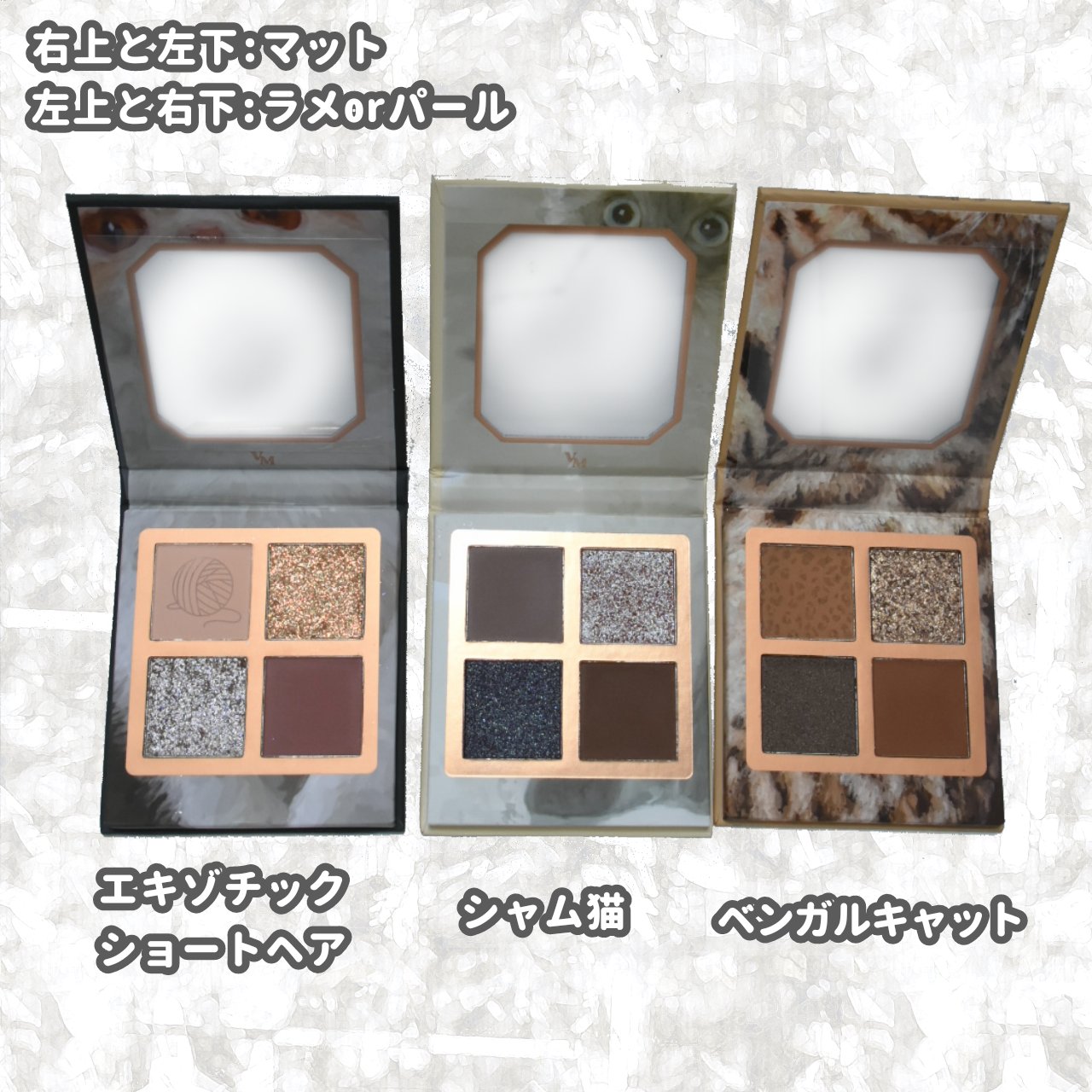 VENUSMARBLEVenusMarbleアイシャドウキャットシリーズ中国コスメ猫ちゃんの絵でパケが可愛い外箱にも、蓋裏にも猫ちゃん鏡付きで便利開閉はマグネットで持ち運びには向かなそうしっかり発色基本的にマットとラメが2色ずつ他のコメントは...