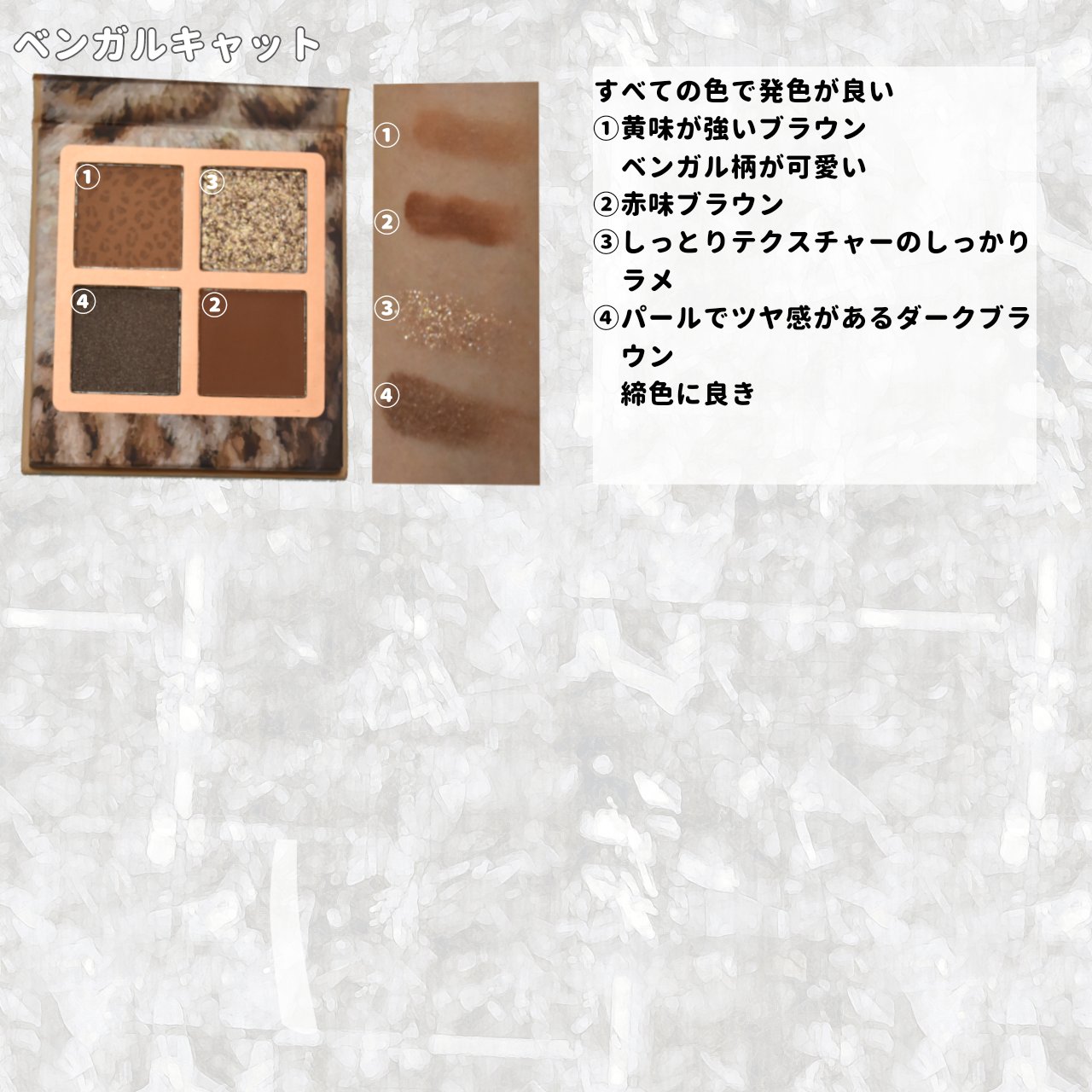 VenusMarbleアイシャドウキャットシリーズエキゾチックショートヘアー¥1,540マット2色とラメ2色のブラウン系で纏まったアイシャドウパレット🎨このパレットの一押しはラメ‼️大粒の多色ラメなのでキラッキラでお気に入りです🎶#中国コスメ...