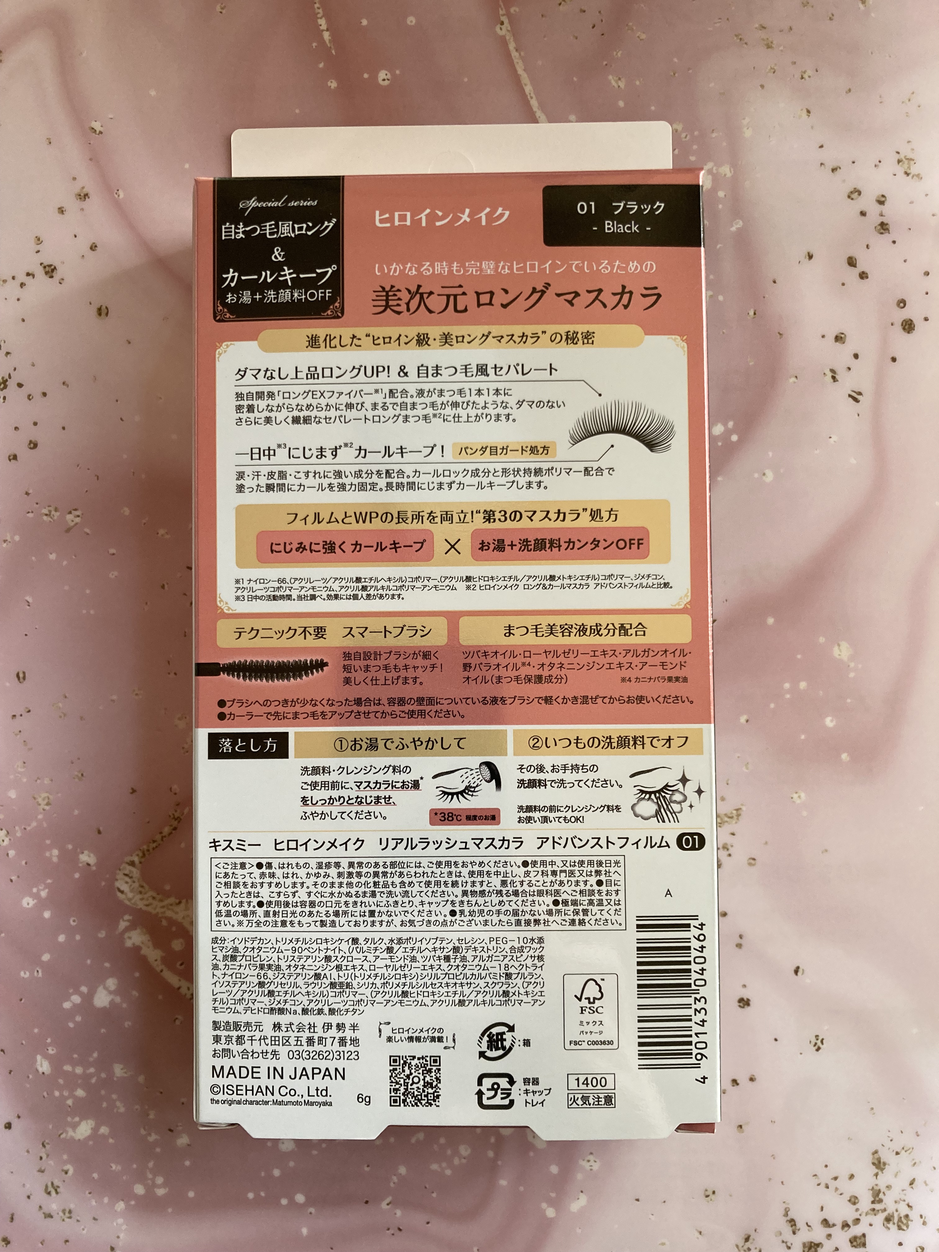 - ■ダマなし上品ロングUP&自まつ毛風セパレート 独自開発の「ロングEXファイバー」を配合。 液がまつ毛1本1本に密着しながらなめらかに伸び、まるで自まつ毛が伸びたような、ダマのない美しく繊細なセパレートロングまつ毛※1に仕上がります。 ※1 ヒロインメイク ロング&カールマスカラ アドバンストフィルムと比較して。 ■一日中※2にじまず※1カールキープ! パンダ目ガード処方 涙・汗・皮脂・こすれに強い成分を配合。カールロック成分と形状持続ポリマー配合で塗った瞬間にカールを強力固定。長時間にじまずカールをキープします。 ※2 日中の活動時間。当社調べ。効果には個人差があります。 ■フィルムとウォータープルーフの長所を両立!“第3のマスカラ”処方 にじみに強くカールキープ × お湯+洗顔料でカンタンにOFFすることができます。 ■テクニック不要 スマートブラシ 細い独自設計のブラシが短いまつ毛もキャッチ! 美しい上品ロングUPまつ毛に仕上げます。 ■6種のまつ毛美容液成分配合 ツバキオイル・ローヤルゼリーエキス・アルガンオイル・野バラオイル(カニナバラ果実油)・オタネニンジンエキス・アーモンドオイル(まつ毛保護成分)