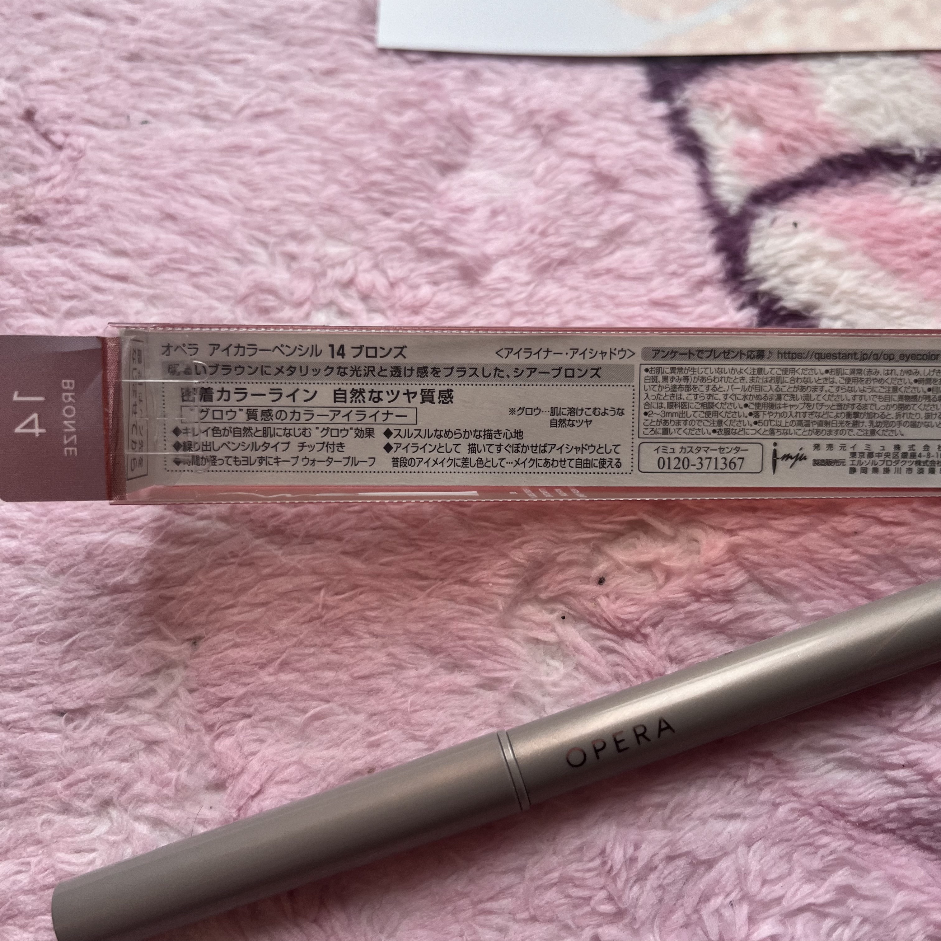 MimiTVのイベントでいただきました。こ、これはかわいい!!!!オペラアイカラーペンシル新色14ブロンズカラー使用。2024.3.15に発売されるよ!なにこのラメ?パール感。めっちゃかわいい!これ1本あるだけでも目元印象変わりそう!くり出す...