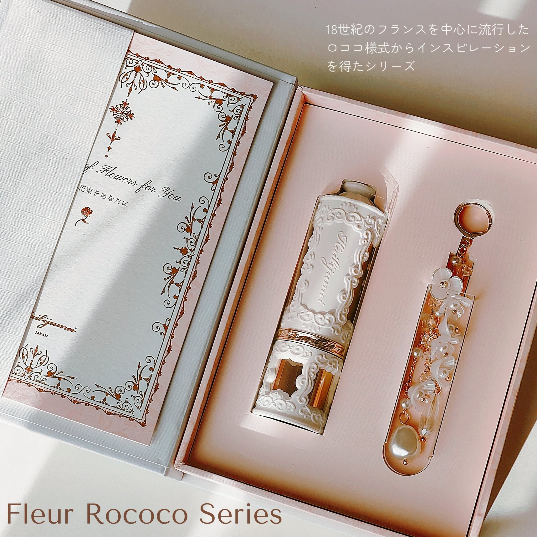 公式オンラインでは名入れサービスもやっていて ご褒美コスメやプレゼントにぴったり。 アンティーク調のパッケージに トキメク新シリーズ 『フルールロココ フラワーリップ』を紹介🥀 デザインを新しく 『フラワーブルームシリーズ』 として展開された 日本限定ピンクゴールドモデル🌹と 軽やかなつけ心地と 優雅な香りのハンドクリーム、