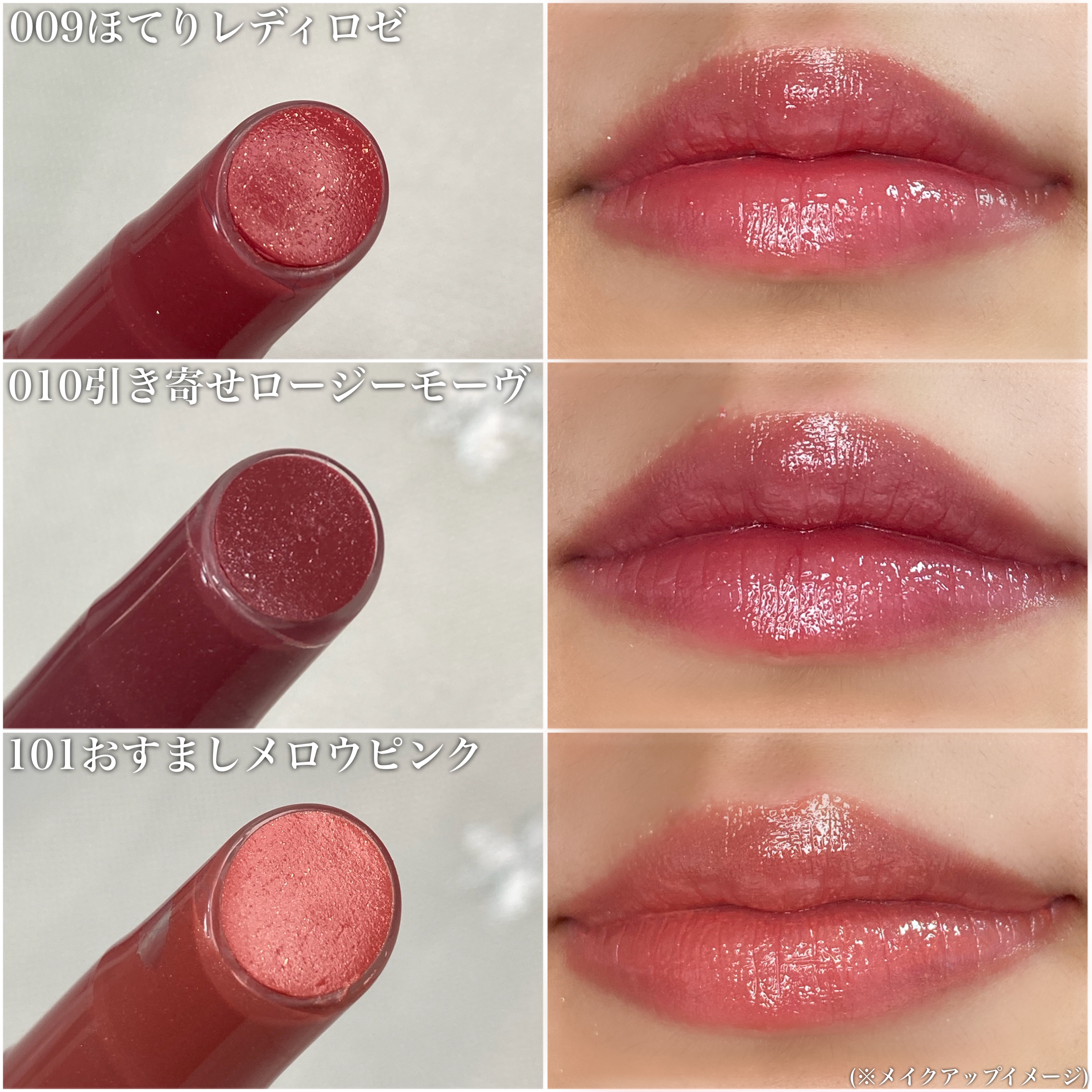 自然でほのかなツヤで“濡れツヤ唇”を演出。 塗り重ねても重くなりにくいテクスチャーで、時間が経っても透明感のあるカラーをキープします。 デイリー使いしやすいカラー展開 ジューシーラスティングティントより、シアーでしっとりとしたツヤタイプなので潤い重視の方にオススメ 重ね塗りで色調整できるので、色の組み合わせ次第ではグラデーションリップが綺麗に作れます
