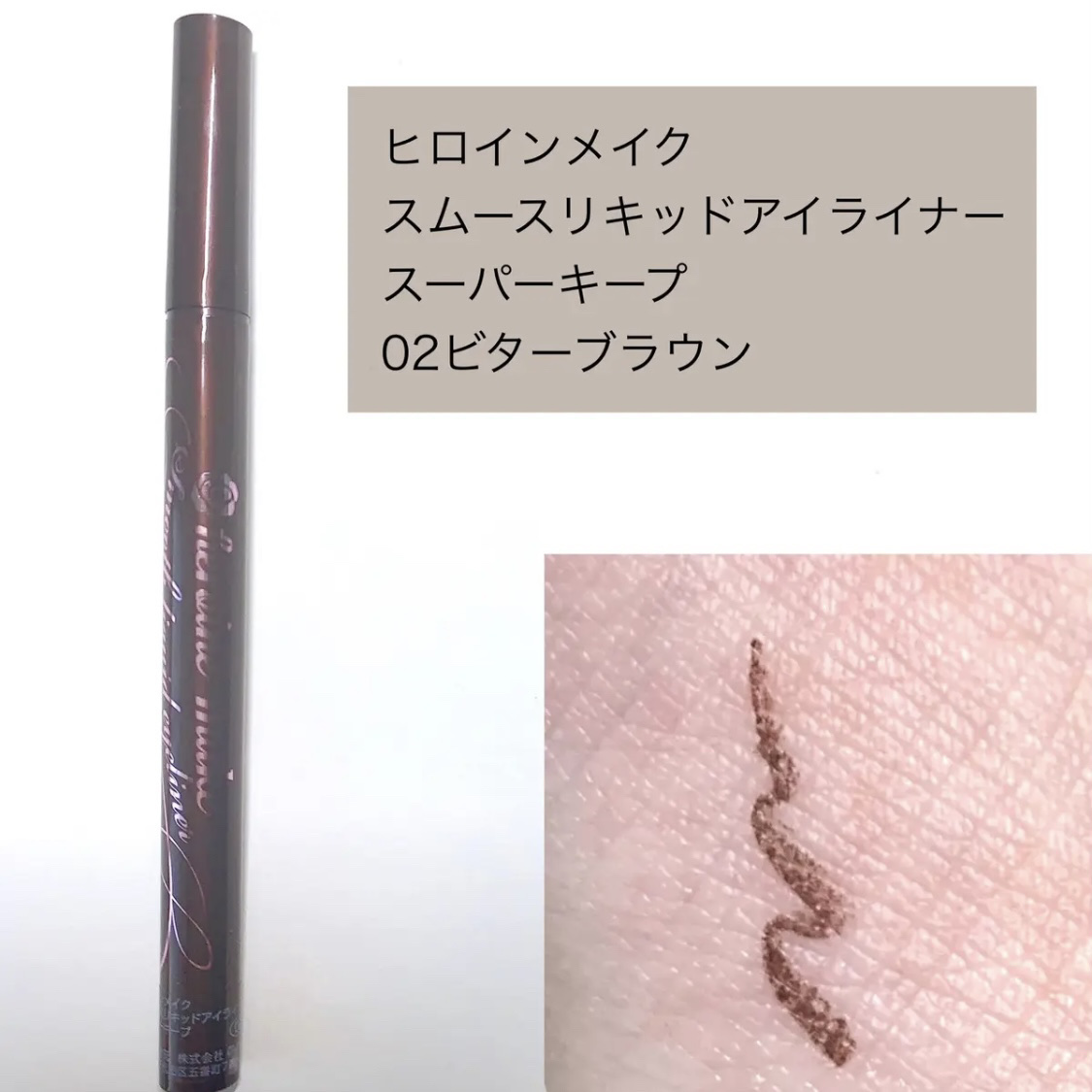 ヒロインメイクスムースリキッドアイライナースーパーキープ🤍02ビターブラウンにじみに強くてお湯落ち!!アイライナーにおいて落ちにくさって重要だったので、密着力の高さがとても嬉しい😍筆先はこしがあって描きやすい!綺麗に簡単に描けます!!02のカ...