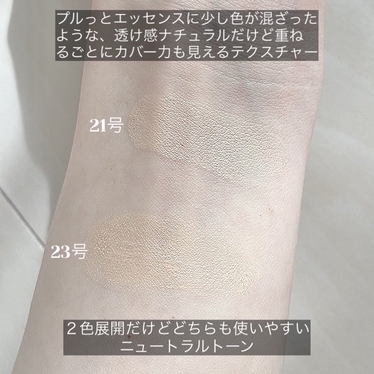 - テクスチャーは、肌が呼吸をするように、軽くて快適な、スキンブリージングテクスチャーです。 スキンケア成分を70%も使っているので、オイル感のあるツヤではなく、しっとりとして潤いが感じられる水分GLOWです。 光の屈折を利用して肌が輝きます。 パフでたたきこむことで、ぴたっと肌に密着し、毛穴もしっかりカバーしてくれます。