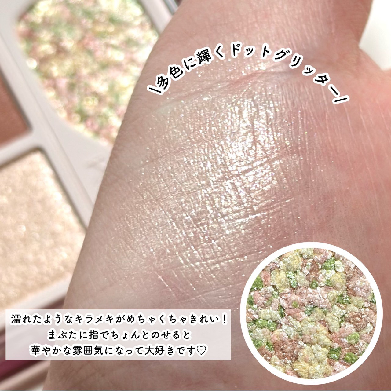 - 混ぜることで、明るさや色みが調整できる、考え抜かれた配色 ◇まとまった4色の中でも、異なる明度、色相を配置し、混ぜることでどの様な肌色にも馴染むように作られたパレット。 その時々の自分に合わせたカラーで目もとを彩ります。 目もとのきらめきを最大限に引き立たせるドットグリッター ◇4色の大粒グリッターを砕かずに手作業で組み合わせることで、多彩な光の粒が複雑にきらめきます。 高密着・美発色処方 ◇アルガンオイル(うるおい成分)配合。 ◇高密着オイルを配合し、とけこむように目もとにフィットします。 ◇クリアパウダーを配合することで、混ぜても色が濁らず、きれいな発色を叶えます。