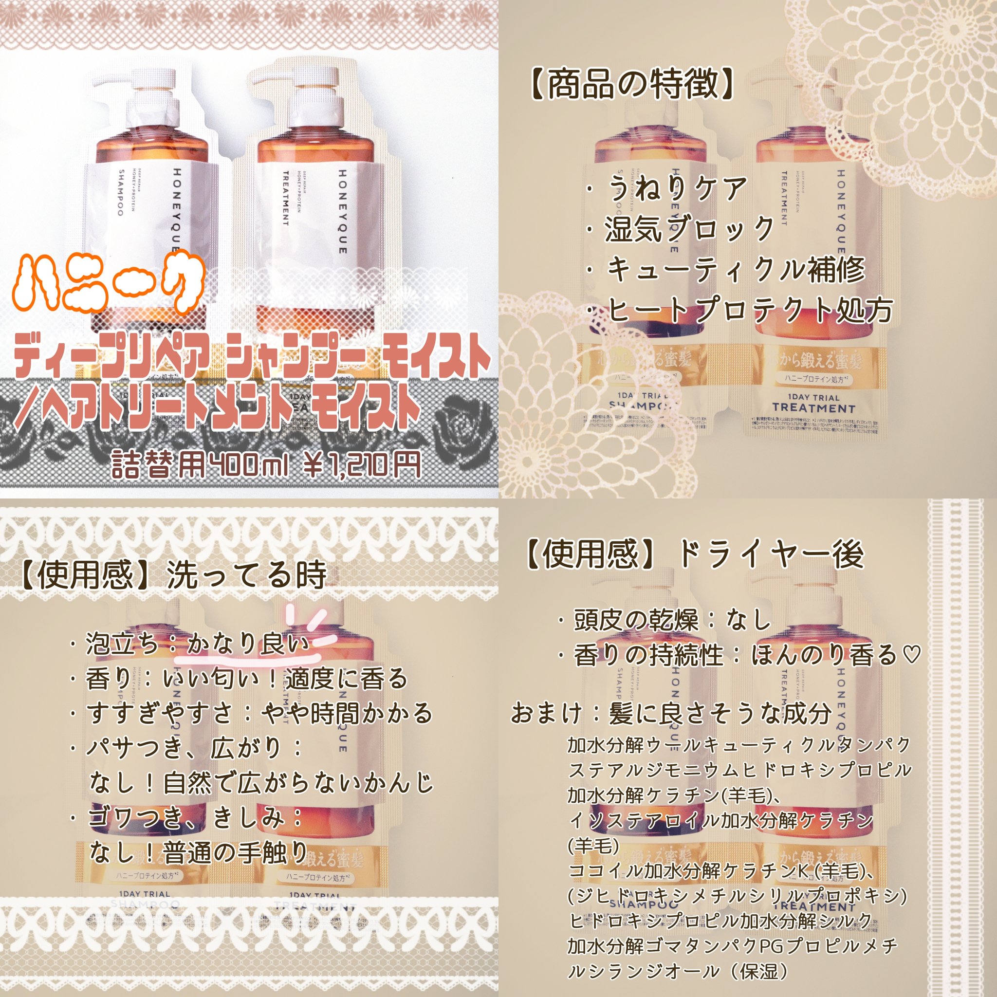 ハニーク ディープリペア シャンプー モイスト/ヘアトリートメント モイスト | 1,650円 |