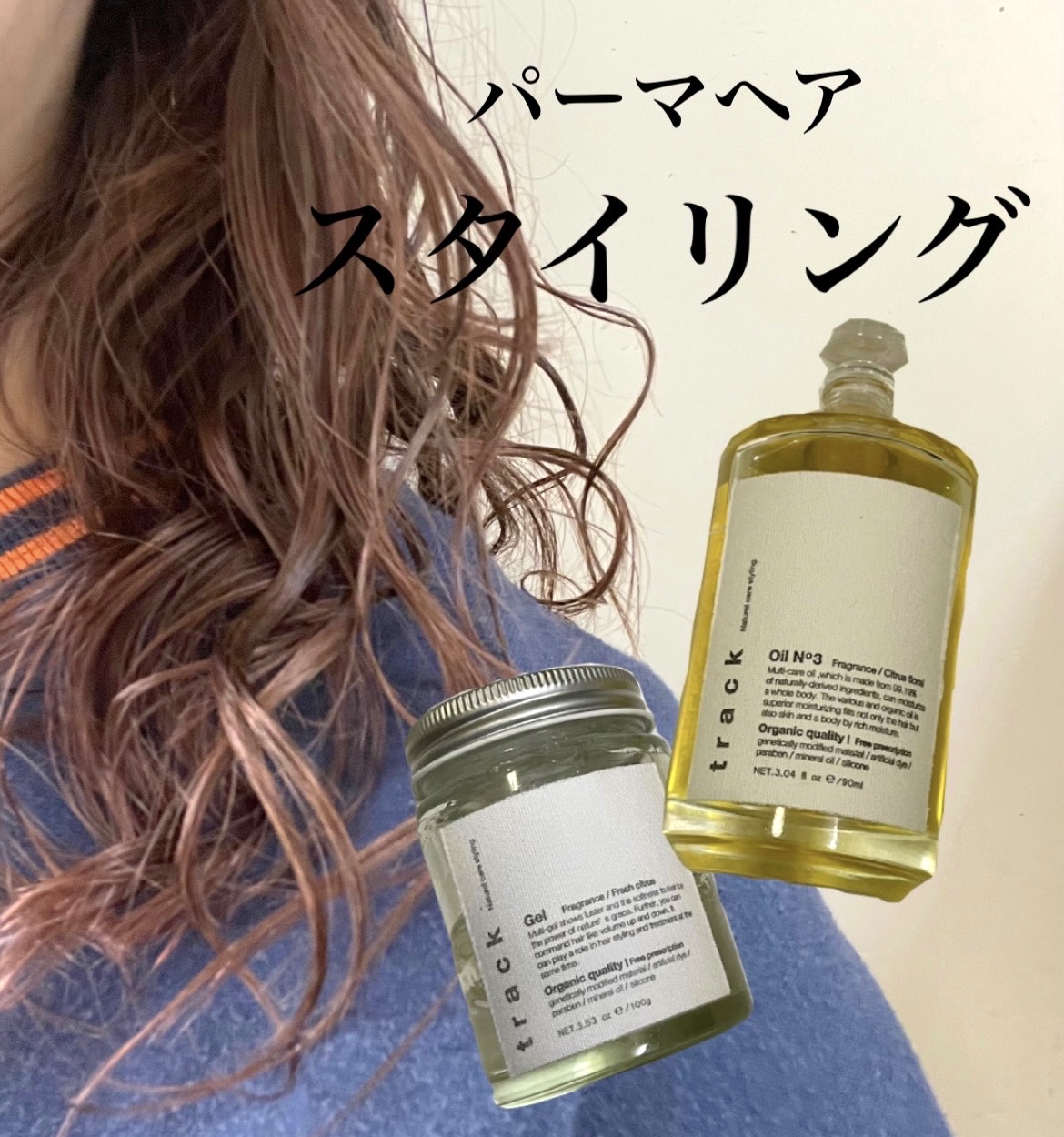 かなり重ためのオイルのため、髪が細いかた、柔らかい髪質の方は特につけすぎに注意してください! 【trackオイル No3】 使用感:かなり重ためのオイル ストレートヘア、巻き髪につける際は、 付けすぎ注意⚠️ 匂い :No3は金木犀の香り癒されます🌿 これを使ってから、"いい匂いする〜" と言われることが増えました♡ 【trackジェル】 使用感:ワックスよりも柔らかく、扱いやすい印象。 重ためですが、伸びがいいので少量で丁度いい です🌱 匂い :ほんのり柑橘系の匂いがしますが、付けると わからないくらいです🍊