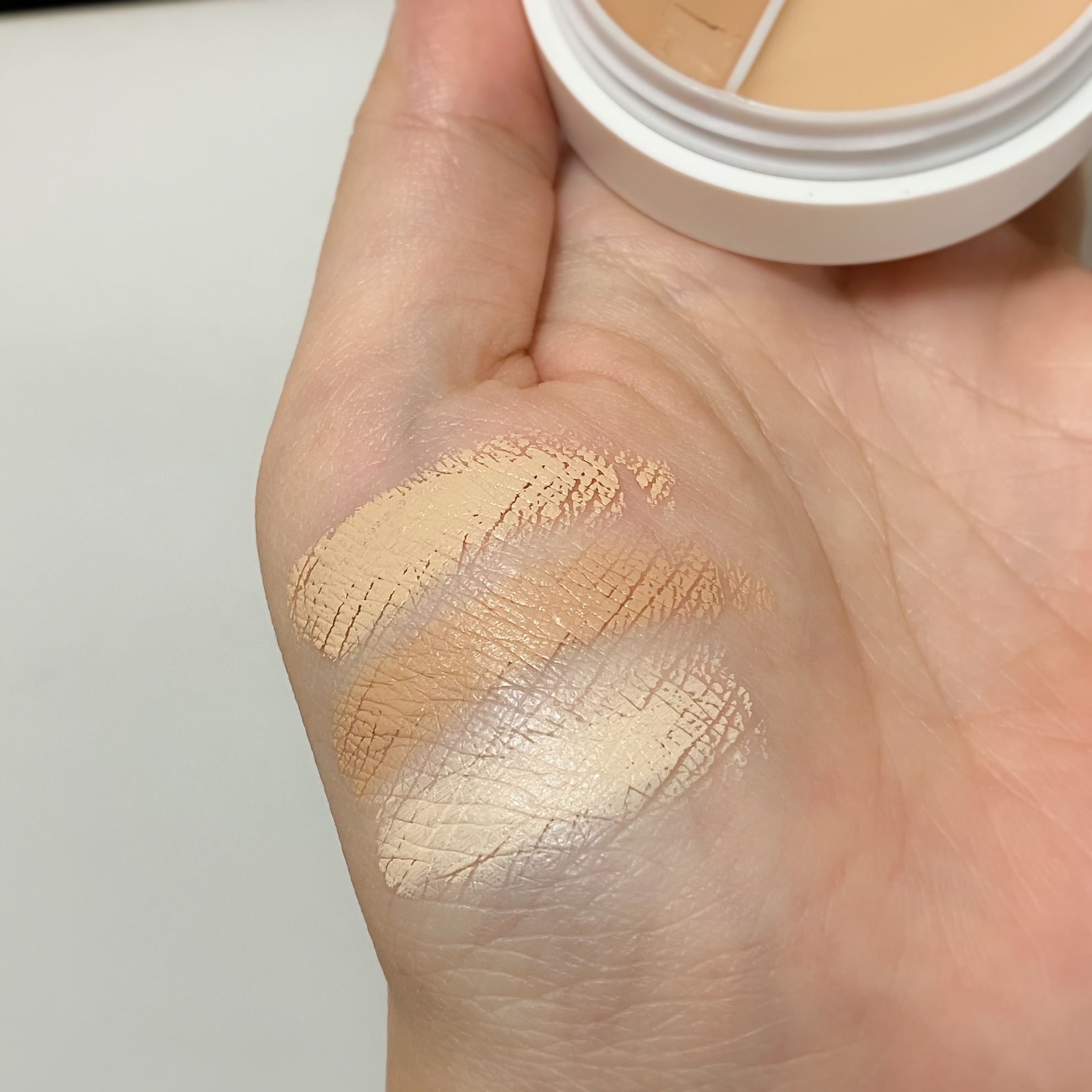 高カバーなバームタイプなので テクスチャは少し粘度を感じます。 指を使って体温で温めながら塗布しても より肌に馴染みやすくなると思います。 ぴたっと密着してしっかり高カバー。持ちも良いように感じました🤍