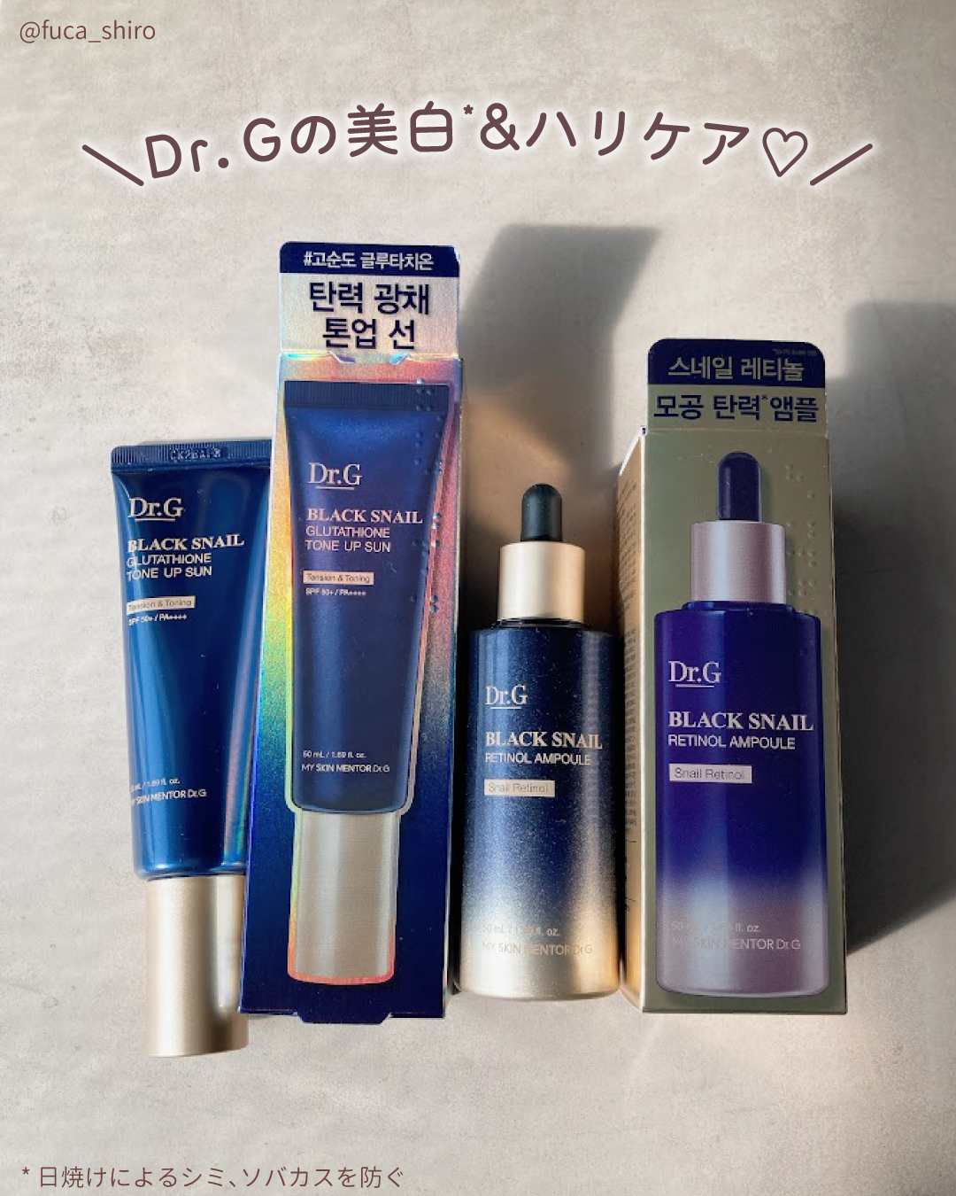 ブラックスネイルと低刺激のレチノールが配合されたセラム ブラックスネイルレチノールはDr.G独自の成分💡 美白効果の高いグルタチオンやナイアシンアミドが入った スキンケア効果の高い日焼け止め 柔らかめのテクスチャーで伸びがいいです ベタつかないのもよかった