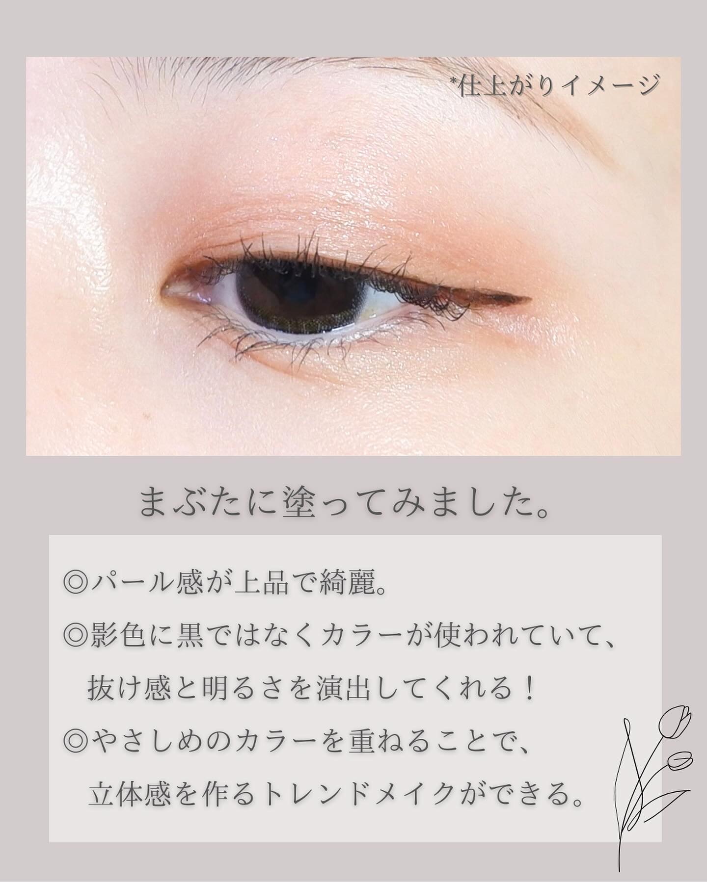 こちらのシリーズはブラウンを基調にほんのりカラーが入っていて、陰影感とカラーを楽しめるのが特徴。 実際に肌に乗せると肌色と合わさって絶妙なピンクブラウンに🌸 ピンクを楽しめつつ、腫れぼったくならないのが◎