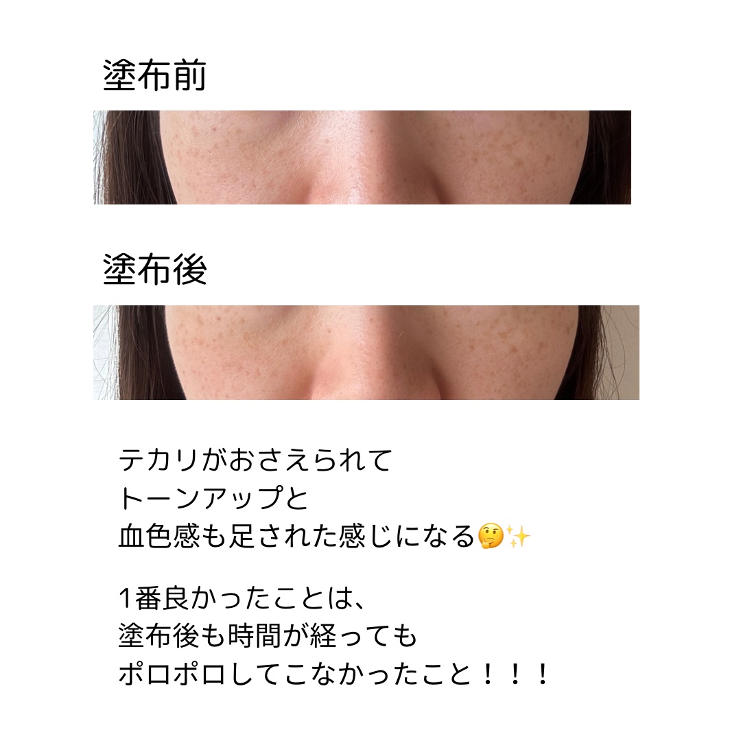 塗布後も、時間が経っても、 お肌こすっても(笑)ポロポロしない! よれてこないのが最高🙆🏻♀️ 塗布後の感触は、 しっとり感を残しつつサラサラした感じ 薄付きなので、カバー力は少なめ 固めのテクスチャーだけどスルスル伸びる パッケージのピンク×ブラック可愛い