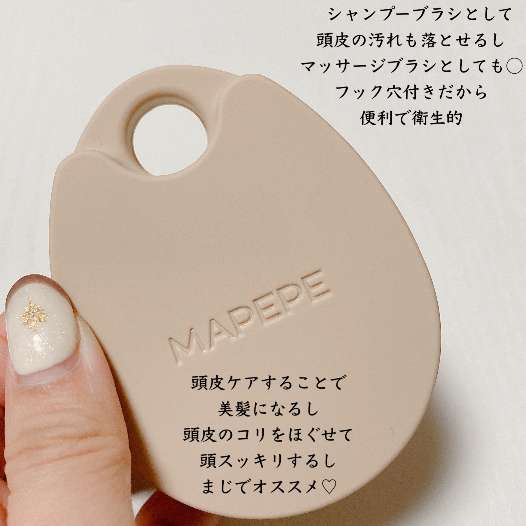 《リラクシングスカルプケアブラシ/MAPEPE》●商品説明シャンプーブラシ、頭皮もみほぐし用ブラシの2WAYで使えるシリコン製のスカルプブラシです。13個の小さな突起が、頭皮をやさしくもみほぐし、気持ちいい刺激を与えます。フック穴の裏に指をか...