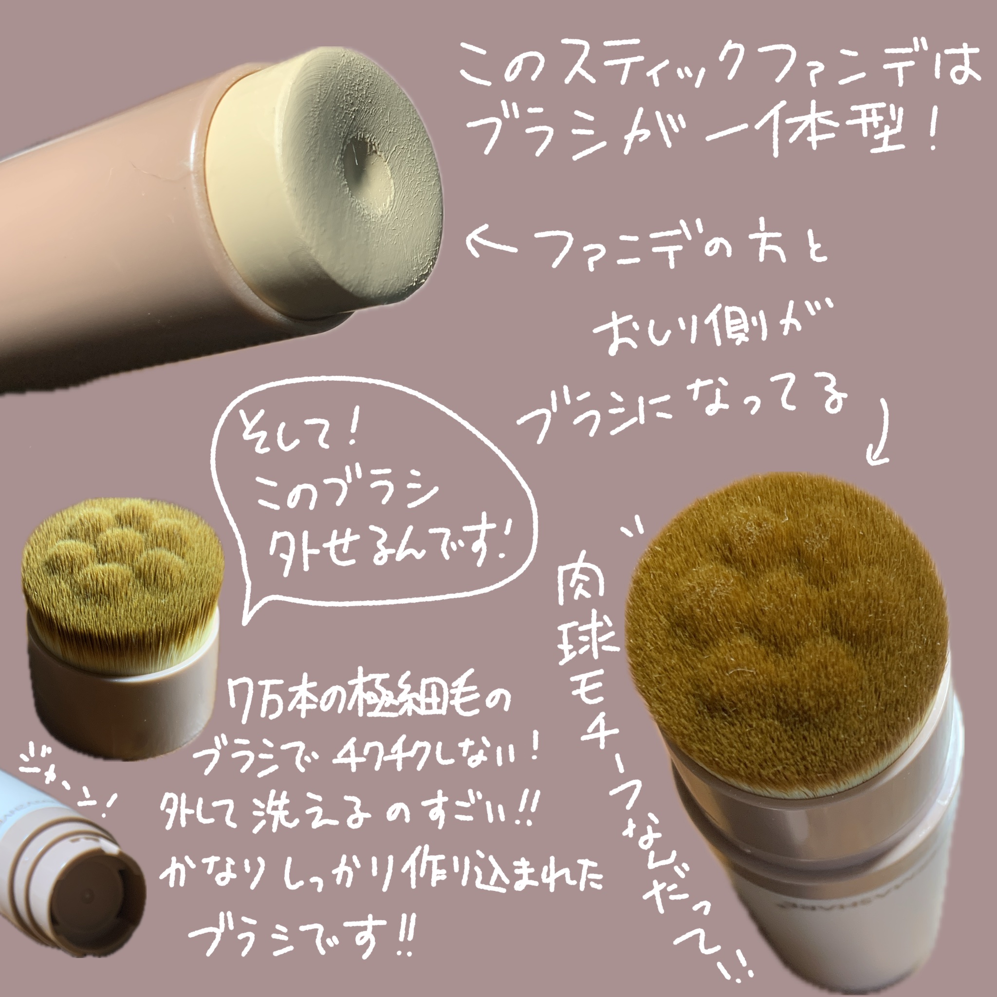 - 「こんなの欲しかった!」 ブラシ一体型の新感覚スティックファンデーション 素肌をアップデートした自然な美肌に。 ブラシ付きでいつでもどこでも簡単きれいに仕上がるきれいのお守り「スティックファンデーション」 point1:ブラシ一体型のスティックファンデーション持ち運びに便利なスティックタイプ。 ブラシ付きで手を汚さず簡単にベースメイクを仕上げることができます。ブラシは取り外し可能で交換・洗浄ができ、衛生的です。 point2:7万本の極細毛ブラシで完成度の高いメイクが実現!立体型の肉球ブラシがお肌の凹凸に合わせて密着し、小鼻や毛穴の気になる部分もムラなくきれいに仕上げることができます。 point3:紫外線ダメージによる乾燥、大気汚染などの外的刺激からお肌を守る植物エキス*配合 *カンゾウ根エキス、ドクダミエキス、オウゴン根エキス、アイブライトエキス(全て保湿成分)
