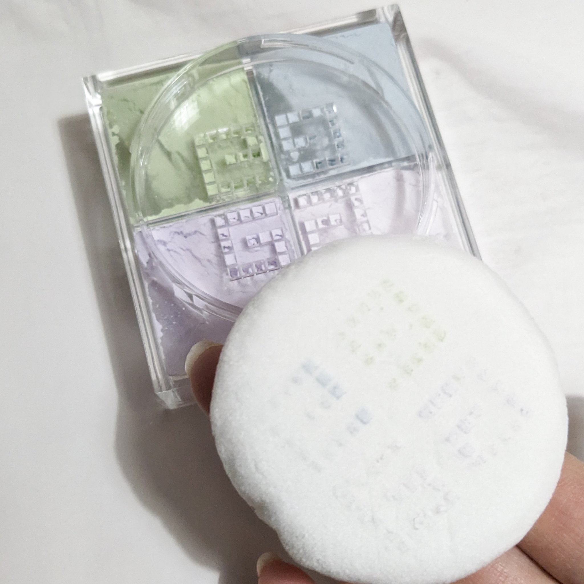 #ジバンシイサマールック ✔️プリズム・リーブル・スキンケアリング・コレクター💜🩵→透明感、💚→赤み消し、🍑→クマや目周りのくすみ、🩷→パウダー後ツヤ&チーク✔️プリズム・リーブル001手持ちの001を使ったよ◎その側から内側にタップして馴染...