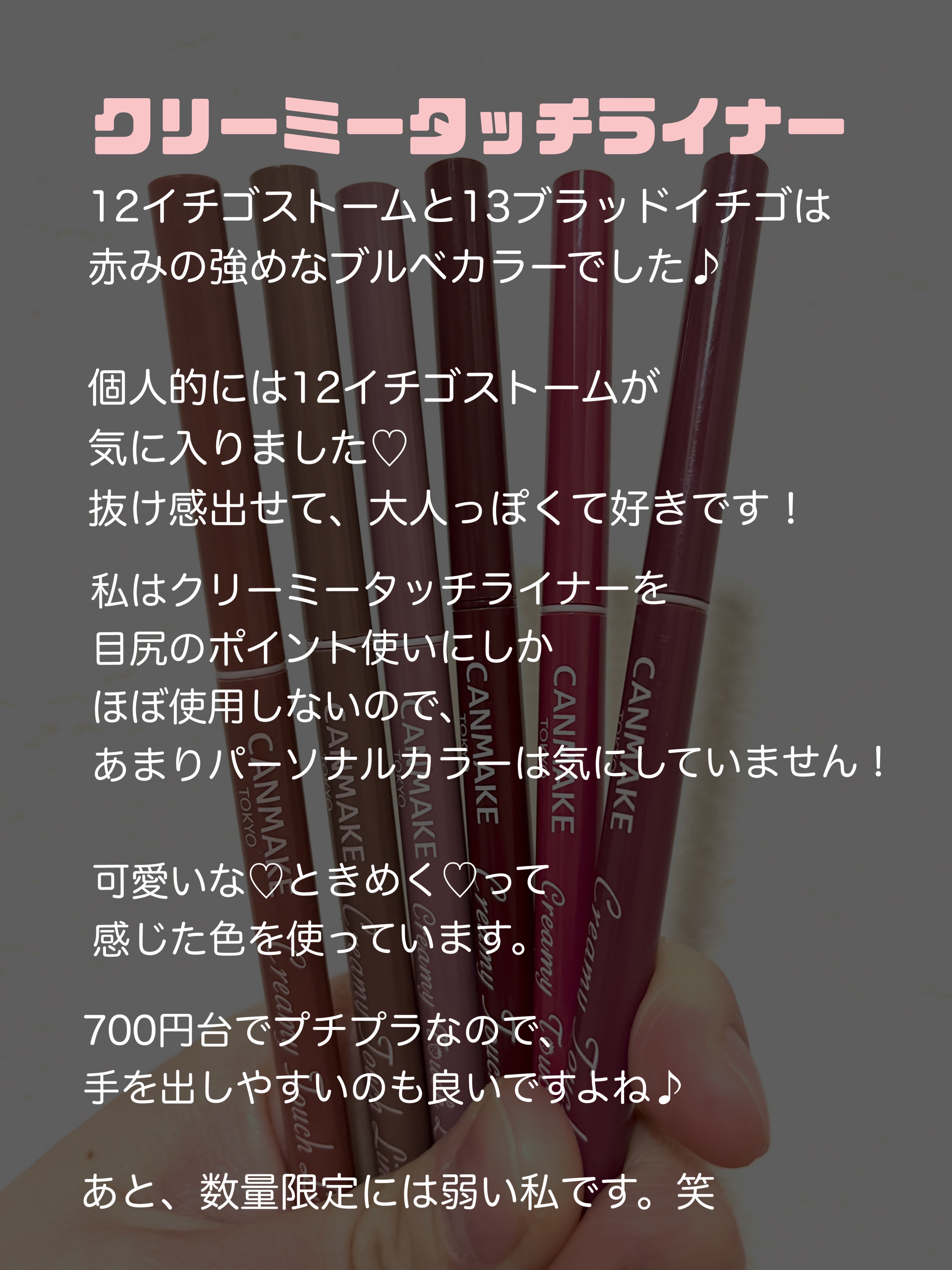 個人的には12イチゴストームが気に入りました! 今日も使いましたが、濃過ぎないので抜け感が出せます。 ハッキリしない色で、抜け感とオシャレ感を出したいならこの色がオススメかな♡ 私はイエベ秋ですが、深みのある色やバーガンディが好きなのでそっちよりの色味が多い気がします。
