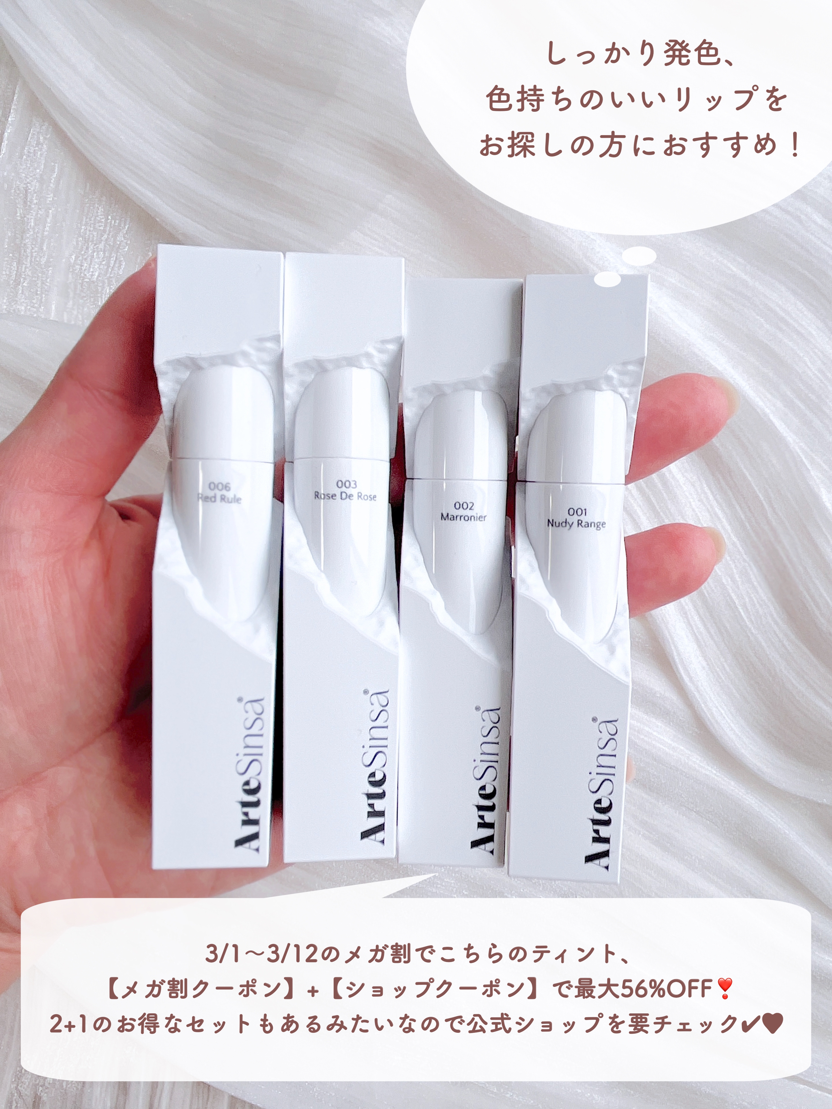 - 【Dewy Fit Tint 】は「彫刻ティント」で話題となったArteSinsanのシグネチャーティント 001/005カラーはリニューアルカラーで登場! 水分たっぷりのしっとりしたテクスチャーにウォータリーコーティングで鮮やかな発色に立体感を与えてくれます。 長持ちする着色力と高い保湿力を兼ね備え、唇に優しい使い心地で使用でき密着力も◎! まるでアーティスティック彫刻のようなティントです。