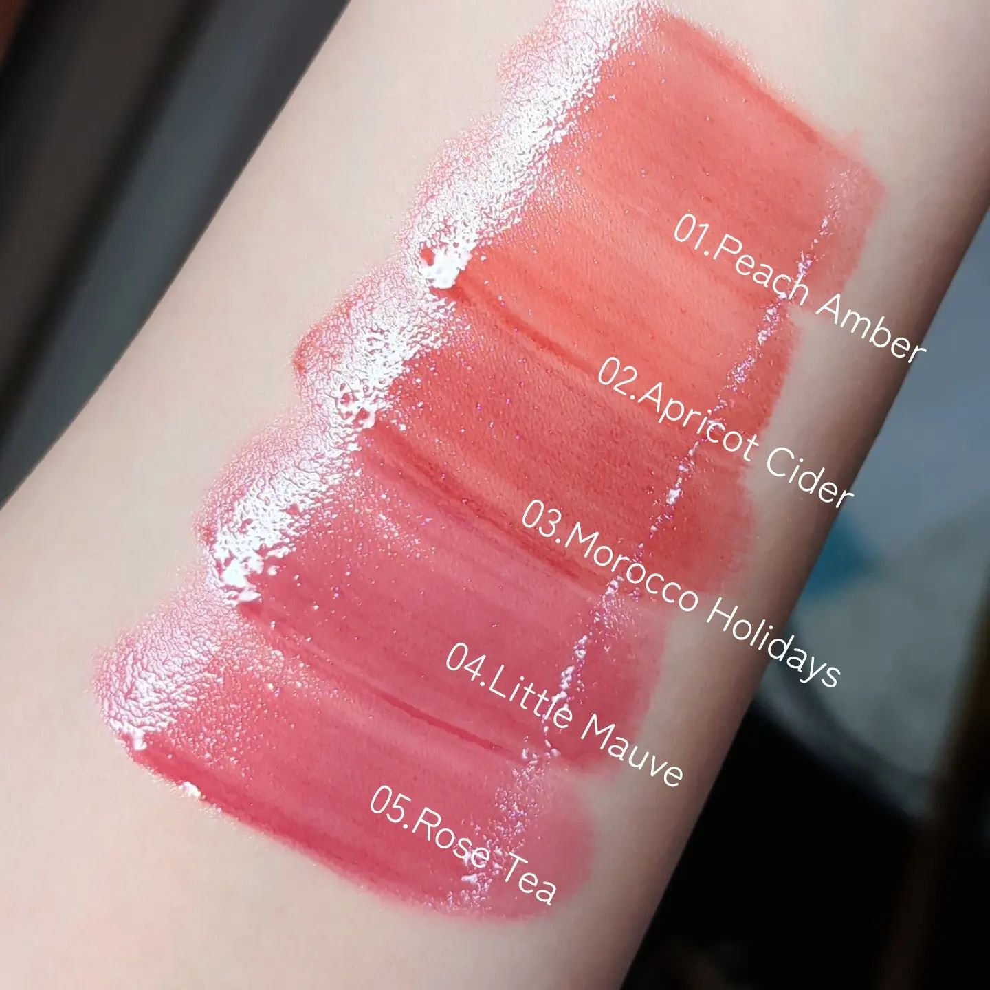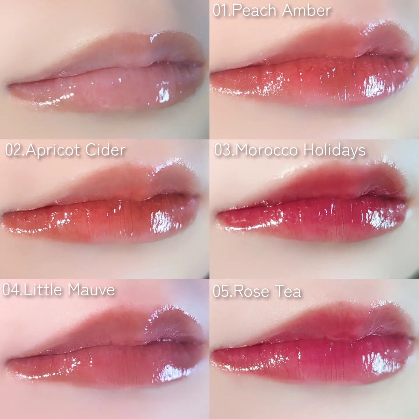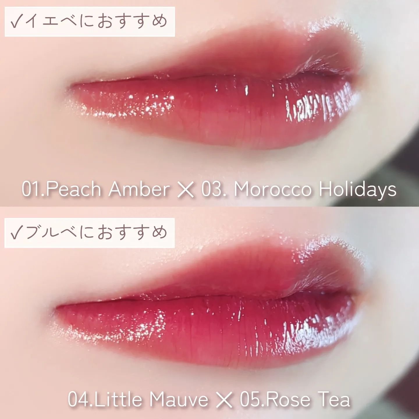 - <01. ピーチアンバー> 水、リンゴ酸ジイソステアリル、ビスジグリセリルポリアシルアジペート-2、ジフェニルシロキシフェニルトリメチコン、ジフェニルジメチコン、水添ポリイソブテン、BG、グリセリン、1,2-ヘキサンジオール、セテアレス-20、セテアリルアルコール、セチルPEG/PPG-10/1ジメチコン、(アクリル酸ヒドロキシエチル/アクリロイルジメチルタウリンNa)コポリマー、ポリソルベート60、フェノキシエタノール、スクワラン、香料、エチルヘキシルグリセリン、EDTA-2Na、イソステアリン酸ソルビタン、水酸化Al、ポリアクリル酸アンモニウム、ホホバ種子油、月見草油、アボカド油、モモ果実エキス、ステアリン酸Na、クエン酸、テトラ(ジ-t-ブチルヒドロキシヒドロケイヒ酸)ペンタエリスリチル、クダモノトケイソウ果実エキス、ヤエヤマアオキ果実エキス、ミルシアリアデュビア果実エキス、アンマロク果実エキス、ヒポファエラムノイデス果実エキス、テルミナリアフェルジナンジアナ果実エキス、酸化チタン、黄5、赤227、赤104(1)、黄4、青1 <02.アプリコットサイダー> 水、リンゴ酸ジイソステアリル、ビスジグリセリルポリアシルアジペート-2、ジフェニルシロキシフェニルトリメチコン、水添ポリイソブテン、ジフェニルジメチコン、BG、グリセリン、1,2-ヘキサンジオール、セテアレス-20、セテアリルアルコール、セチルPEG/PPG-10/1ジメチコン、(アクリル酸ヒドロキシエチル/アクリロイルジメチルタウリンNa)コポリマー、ポリソルベート60、フェノキシエタノール、スクワラン、香料、エチルヘキシルグリセリン、EDTA-2Na、イソステアリン酸ソルビタン、アボカド油、ホホバ種子油、月見草油、モモ果実エキス、ステアリン酸Na、クエン酸、テトラ(ジ-t-ブチルヒドロキシヒドロケイヒ酸)ペンタエリスリチル、アンマロク果実エキス、クダモノトケイソウ果実エキス、ヒポファエラムノイデス果実エキス、テルミナリアフェルジナンジアナ果実エキス、ヤエヤマアオキ果実エキス、ミルシアリアデュビア果実エキス、酸化チタン、黄5、赤227、赤104(1)、青1 <03.モロッコホリデーズ> 水、リンゴ酸ジイソステアリル、ビスジグリセリルポリアシルアジペート-2、ジフェニルシロキシフェニルトリメチコン、ジフェニルジメチコン、水添ポリイソブテン、BG、グリセリン、1,2-ヘキサンジオール、セテアレス-20、セテアリルアルコール、セチルPEG/PPG-10/1ジメチコン、(アクリル酸ヒドロキシエチル/アクリロイルジメチルタウリンNa)コポリマー、ポリソルベート60、フェノキシエタノール、スクワラン、香料、エチルヘキシルグリセリン、EDTA-2Na、イソステアリン酸ソルビタン、水酸化Al、ポリアクリル酸アンモニウム、ホホバ種子油、月見草油、アボカド油、モモ果実エキス、ステアリン酸Na、クエン酸、テトラ(ジ-t-ブチルヒドロキシヒドロケイヒ酸)ペンタエリスリチル、クダモノトケイソウ果実エキス、ヤエヤマアオキ果実エキス、ミルシアリアデュビア果実エキス、アンマロク果実エキス、ヒポファエラムノイデス果実エキス、テルミナリアフェルジナンジアナ果実エキス、酸化チタン、黄5、赤227、赤104(1)、青1、黄4 <04. リトルモーブ> 水、リンゴ酸ジイソステアリル、ビスジグリセリルポリアシルアジペート-2、ジフェニルシロキシフェニルトリメチコン、ジフェニルジメチコン、水添ポリイソブテン、BG、グリセリン、1,2-ヘキサンジオール、セテアレス-20、セテアリルアルコール、セチルPEG/PPG-10/1ジメチコン、(アクリル酸ヒドロキシエチル/アクリロイルジメチルタウリンNa)コポリマー、ポリソルベート60、フェノキシエタノール、スクワラン、香料、エチルヘキシルグリセリン、EDTA-2Na、イソステアリン酸ソルビタン、水酸化Al、ポリアクリル酸アンモニウム、ホホバ種子油、月見草油、アボカド油、モモ果実エキス、ステアリン酸Na、クエン酸、テトラ(ジ-t-ブチルヒドロキシヒドロケイヒ酸)ペンタエリスリチル、クダモノトケイソウ果実エキス、ヤエヤマアオキ果実エキス、ミルシアリアデュビア果実エキス、アンマロク果実エキス、ヒポファエラムノイデス果実エキス、テルミナリアフェルジナンジアナ果実エキス、酸化チタン、赤227、赤104(1)、黄5、黄4、青1 <05.ローズティー> 水、リンゴ酸ジイソステアリル、ビスジグリセリルポリアシルアジペート-2、ジフェニルシロキシフェニルトリメチコン、ジフェニルジメチコン、水添ポリイソブテン、BG、グリセリン、1,2-ヘキサンジオール、セテアレス-20、セテアリルアルコール、セチルPEG/PPG-10/1ジメチコン、(アクリル酸ヒドロキシエチル/アクリロイルジメチルタウリンNa)コポリマー、ポリソルベート60、フェノキシエタノール、スクワラン、香料、エチルヘキシルグリセリン、EDTA-2Na、イソステアリン酸ソルビタン、水酸化Al、ポリアクリル酸アンモニウム、ホホバ種子油、月見草油、アボカド油、モモ果実エキス、ステアリン酸Na、クエン酸、テトラ(ジ-t-ブチルヒドロキシヒドロケイヒ