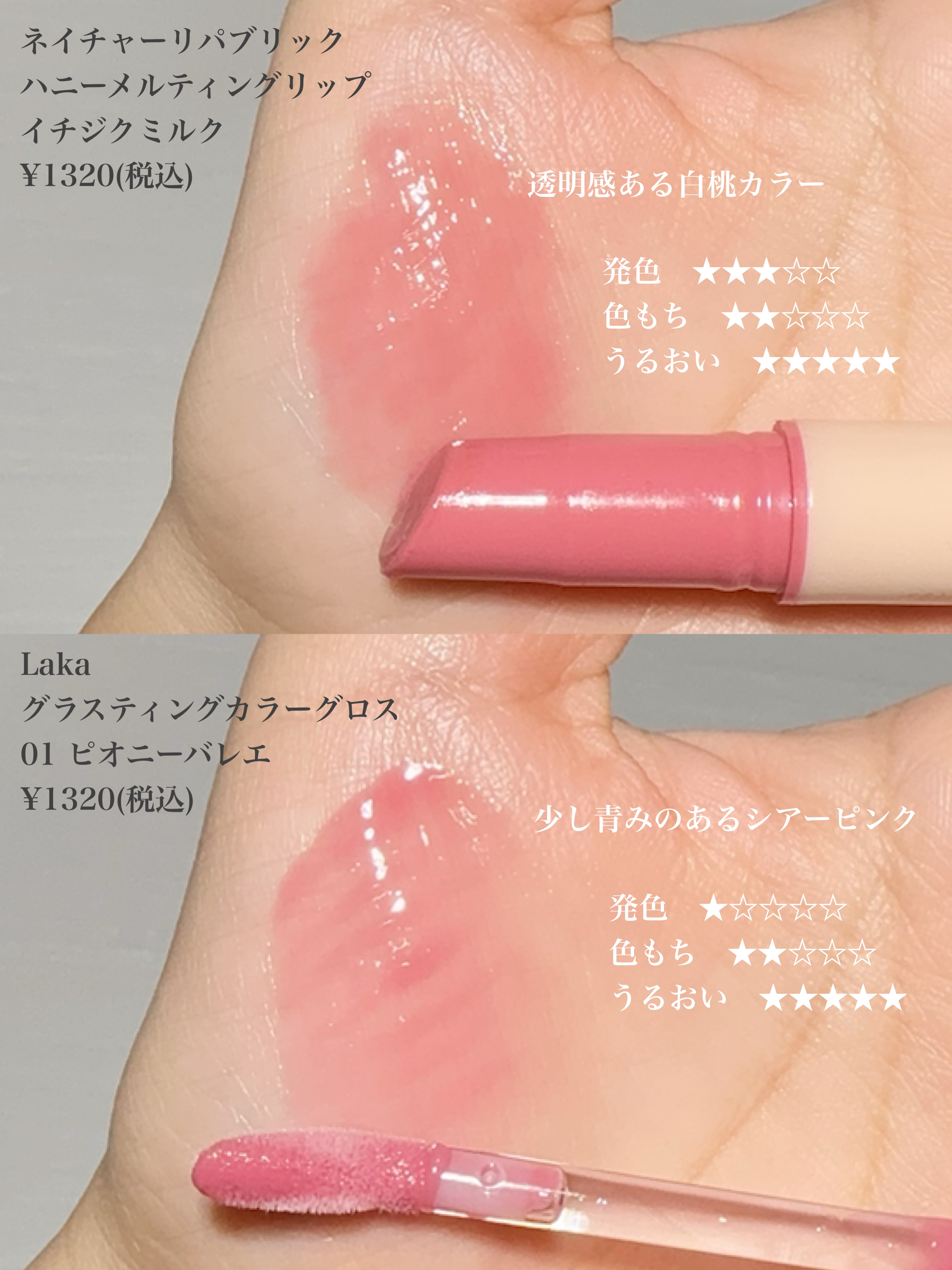 ねっちょりボリューム感あるテクスチャーだけど、ベタつきなく使いやすい。 ティントじゃない普通のグロスだから色もちは良くない。 発色ナチュラルだからこれだけでもいいけど、他のリップと合わせても可愛い!!