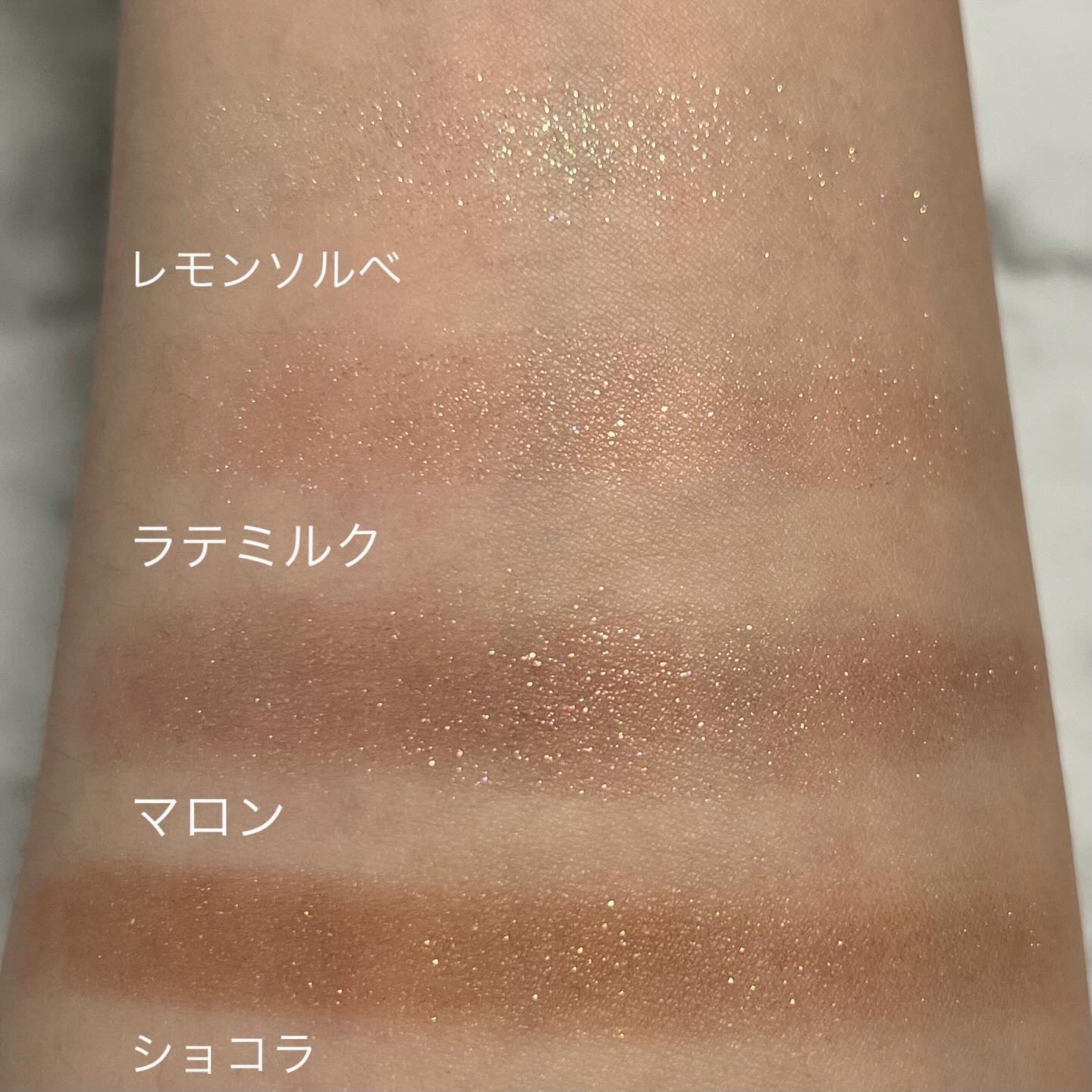 - 2A ファーストドリーム 1.パールピンク (左上) ジメチコン,マイカ,ミネラルオイル,ホウケイ酸(Ca/Al),酸化チタン,タルク,シリカ,トリ(カプリル酸/カプリン酸) グリセリル,ポリイソブテン,合成フルオロフロゴパイト,ジメチコンクロスポリマー,ステアリン酸Mg,ラウリン酸ヘキシル,窒化ホウ素,(ビニルジメチコン/メチコンシルセスキオキサン) クロスポリマー,オキシ塩化ビスマス,マイクロクリスタリンワックス,トリエトキシカプリリルシラン,酸化スズ,メチルパラベン,プロピルパラベン 2.ピーチソルベ (右上) ジメチコン,合成フルオロフロゴパイト,ミネラルオイル,マイカ, 酸化チタン,ホウケイ酸(Ca/Al),タルク,シリカ,トリ(カプリル酸/カプリン酸)グリセリル,ポリイソブテン,ジメチコンクロスポリマー,ステアリン酸Mg,ラウリン酸ヘキシル,窒化ホウ素,(ビニルジメチコン/メチコンシルセスキオキサン)クロスポリマー,酸化鉄,オキシ塩化ビスマス,マイクロクリスタリンワックス,トリエトキシカプリリルシラン,赤102,酸化スズ,赤 201,メチルパラベン,プロピルパラベン,黄4 3.バーガンディレッド (左下) ジメチコン,マイカ,ミネラルオイル,酸化鉄,タルク,シリカ,トリ(カプリル酸/カプリン酸)グリセリル,酸化チタン,ポリイソブテン,ジメチコンクロスポリマー,ステアリン酸Mg,合成フルオロフロゴパイト,ラウリン酸ヘキシル,窒化ホウ素,(ビニルジメチコン/メチコンシルセスキオキサン) クロスポリマ―,ホウケイ酸(Ca/Al),オキシ塩化ビスマス,マイクロクリスタリンワックス,赤104 (1),トリエトキシカプリリルシラン,メチルパラベン,プロピルパラベン,酸化スズ,青 1 4.カシス (右下) ジメチコン,マイカ,酸化鉄,ミネラルオイル,トリ(カプリル酸/カプリン酸) グリセリル,シリカ,タルク,ポリイソブテン,ジメチコンクロスポリマー,酸化チタン,ステアリン酸Mg,ホウケイ酸(Ca/AI),ラウリン酸ヘキシル,窒化ホウ素,ビニルジメチコン/メチコンシルセスキオキサン) クロスポリマー,合成フルオロフロゴパイト,マイクロクリスタリンワックス,オキシ塩化ビスマス,トリエトキシカプリリルシラン,メチルパラベン,プロピルパラベン,酸化スズ,青1 3A タイムレスエンヴィ 1.レモンソルベ(左上) ジメチコン, ホウケイ酸(Ca/Al), ミネラルオイル, タルク, マイカ, シリカ,トリ(カプリル酸/カプリン酸) グリセリル,ポリイソブテン,ジメチコンクロスポリマー, ステアリン酸Mg、 酸化チタン, ラウリン酸ヘキシル,窒化ホウ素,(ビニルジメチコン/メチコンシルセスキオキサン)クロスポリマー, オキシ塩化ビスマス, マイクロクリスタリンワックス, 酸化スズ, トリエトキシカプリリルシラン,メチルパラベン、酸化鉄, プロピルパラベン, 青1 2. ラテミルク (右上) ジメチコン, マイカ,ホウケイ酸(Ca/Al), ミネラルオイル,酸化チタン,タルク, 合成フルオロフロゴパイト, シリカ,トリ (カプリル酸/カプリン酸)グリセリル, ポリイソブテン,ジメチコンクロスポリマー, ステアリン酸Mg, ラウリン酸ヘキシル,窒化ホウ素,(ビニルジメチコン/メチコンシルセスキオキサン)クロスポリマー, オキシ塩化ビスマス, 酸化鉄, マイクロクリスタリンワックス, トリエトキシカプリリルシラン,酸化スズ,赤102, 赤201, メチルパラベン,プロピルパラベン,黄4 3.マロン (左下) ジメチコン, マイカ, ミネラルオイル, 合成フルオロフロゴパイト, ホウケイ酸(Ca/Al), タルク,酸化チタン,シリカ, トリ(カプリル酸/カプリン酸) グリセリル,酸 化鉄, ポリイソブテン,ジメチコンクロスポリマー, ステアリン酸Mg,(ビニルジメチコン/メチコンシルセスキオキサン) クロスポリマー, オキシ塩化ビスマス, マイクロクリスタリンワックス, トリエトキシカプリリルシラン,酸化スズ, 赤201, メチルパラベン,赤102 4. ショコラ (右下) ジメチコン, マイカ, ミネラルオイル,酸化鉄, タルク, シリカ,トリ(カプリル酸/カプリン酸) グリセリル,ポリイソブテン,ジメチコンクロスポリマー, ホウケイ酸(Ca/Al), ステアリン酸Mg,酸化チタン,合成フルオロフロゴパイト, ラウリン酸ヘキシル, 窒化ホウ素,(ビニルジメチコン/メチコンシルセスキオキサン)クロスポリマー, オキシ塩化ビスマス,マイクロクリスタリンワックス, トリエトキシカプリリルシラン,メチルパラベン,プロピルパラベン,酸化スズ 5A スパークリングジュエル 1.ベビースキン (左上) ジメチコン,マイカ,ホウケイ酸(Ca/Al),ミネラルオイル,酸化チタン,タルク,シリカ,トリ(カプリル酸/カプリン酸) グリセリル,ポリイソブテン,ジメチコンクロスポリマー,ステアリン酸Mg,合成フルオロフロゴパイト,ラウリン酸ヘキシル,酸化鉄,窒化ホウ素,(ビニルジメチコン/メチコンシルセスキオキサン)クロスポリマー,オキシ塩化ビスマス,マイクロクリスタリンワックス,トリエトキシカプリリルシラン,酸化スズ,メチルパラベン,プロピルパラベン 2.シャンパーニュ ゴールド (右上) ジメチコン,ホウケイ酸(Ca/Al),ミネラルオイル,タルク,マイカ,シリカ,トリ(カプリル酸/カプリン酸) グリセリル,ポリイソブテン,ジメチコンクロスポリマー,ステア
