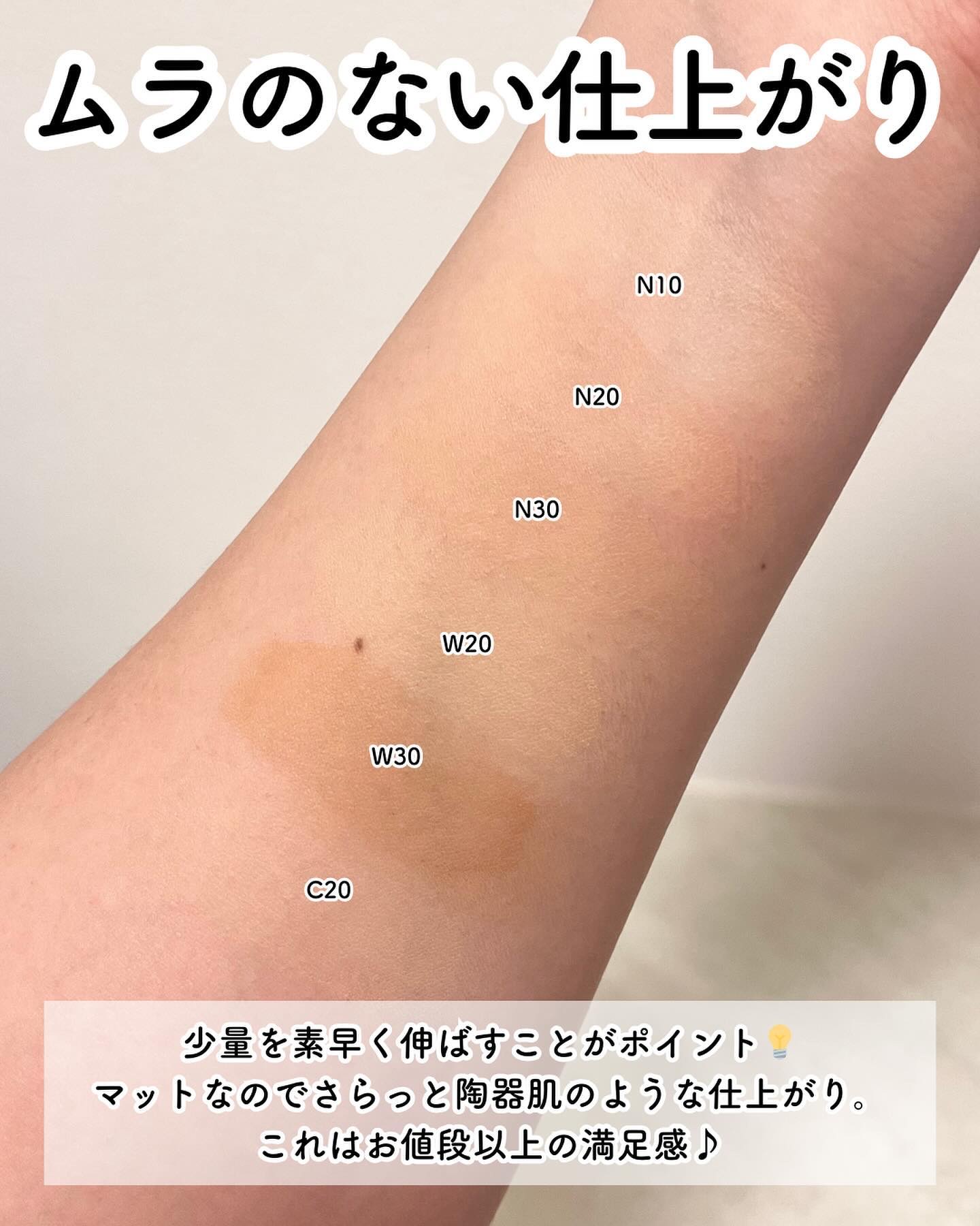 - 超うす膜なのに、崩れにくい。 全瞬間ビジュがいい。 1. 超うす膜が、ぴたっと密着 軽い微粒子が薄膜を作り、スーッと伸びて肌と一体化するように密着する、 「リアルスキンフィルム処方」を採用。 だから、時間がたっても、崩れにくい。 なのに、心地よさつづく。 2.毛穴レス*1で、透明感のある肌*2 薄膜なのに毛穴・くすみはぼかし、きめ細かく透けるような肌*1へ。 「ナイアシンアミド配合」*3 全6色展開 *1メイクアップ効果により毛穴をカバーすること *2メイクアップ効果による *3保湿効果 ※2026年2月10日〜パッケージリニューアル