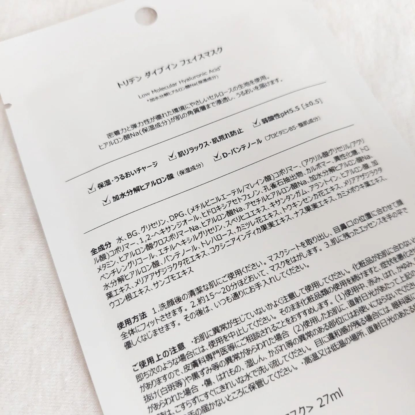 韓国コスメ評価アプリファヘビューティーアワード 3年連続1位* 2023年オリーブヤングアワード エッセンス/セラム部門3位受賞の実績もあって使うと納得する使い心地 シンプルな処方となっていて成分は5種類のヒアルロン酸やD-パンテノールアラントインだからどんなスキンケアとも相性が良く攻め系成分のスキンケアとも相性◎ ダイブインセラムの長所を1枚に詰め込んだダイブインマスク。 2つとも使用することで水分爆弾!!