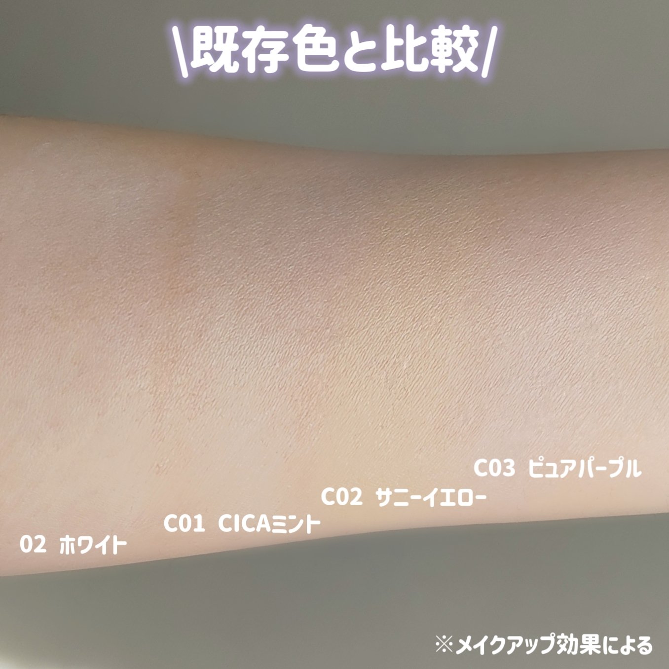 - <01 透明> 水、メトキシケイヒ酸エチルヘキシル、BG、ジエチルアミノヒドロキシベンゾイル安息香酸ヘキシル、酸化亜鉛、ラウリン酸メチルへプチル、酸化チタン、ジメチコン、(アクリル酸ヒドロキシエチル/アクリロイルジメチルタウリンNa)コポリマー、シクロペンタシロキサン、ビスエチルヘキシルオキシフェノールメトキシフェニルトリアジン、リンゴ酸ジイソステアリル、水酸化Al、PEG-60水添ヒマシ油、ステアリン酸、フェノキシエタノール、ポリグリセリル-3ポリジメチルシロキシエチルジメチコン、ポリヒドロキシステアリン酸、ホホバエステル、キサンタンガム、アルギニン、ヒアルロン酸Na、α-グルカン、フィチン酸、ユキノシタエキス、グルコシルセラミド、ソメイヨシノ葉エキス、ハトムギ種子エキス、マグワ根皮エキス、メマツヨイグサ種子エキス、酸化銀、セイヨウナツユキソウ花エキス、ビルベリー葉エキス、アーチチョーク葉エキス <02 ホワイト> 水、メトキシケイヒ酸エチルヘキシル、BG、酸化チタン、ジエチルアミノヒドロキシベンゾイル安息香酸ヘキシル、酸化亜鉛、ラウリン酸メチルへプチル、ジメチコン、(アクリル酸ヒドロキシエチル/アクリロイルジメチルタウリンNa)コポリマー、シクロペンタシロキサン、ビスエチルヘキシルオキシフェノールメトキシフェニルトリアジン、リンゴ酸ジイソステアリル、オクチルドデカノール、水酸化Al、PEG-60水添ヒマシ油、ポリグリセリル-3ポリジメチルシロキシエチルジメチコン、ステアリン酸、フェノキシエタノール、ポリヒドロキシステアリン酸、ホホバエステル、キサンタンガム、トリヒドロキシステアリン、アルミナ、シリカ、アルギニン、ヒアルロン酸Na、α-グルカン、フィチン酸、ユキノシタエキス、グルコシルセラミド、ソメイヨシノ葉エキス、ハトムギ種子エキス、マグワ根皮エキス、メマツヨイグサ種子エキス、酸化銀、セイヨウナツユキソウ花エキス、ビルベリー葉エキス、アーチチョーク葉エキス <C01 CICAミント> 水、メトキシケイヒ酸エチルヘキシル、BG、ジエチルアミノヒドロキシベンゾイル安息香酸ヘキシル、酸化チタン、酸化亜鉛、ラウリン酸メチルへプチル、ジメチコン、(アクリル酸ヒドロキシエチル/アクリロイルジメチルタウリンNa)コポリマー、シクロペンタシロキサン、ビスエチルヘキシルオキシフェノールメトキシフェニルトリアジン、リンゴ酸ジイソステアリル、オクチルドデカノール、水酸化Al、PEG-60水添ヒマシ油、ポリグリセリル-3ポリジメチルシロキシエチルジメチコン、ステアリン酸、フェノキシエタノール、ポリヒドロキシステアリン酸、ホホバエステル、香料、キサンタンガム、酸化鉄、グンジョウ、トリヒドロキシステアリン、アルミナ、トリイソステアリン酸ポリグリセリル-2、青1、シリカ、アルギニン、ヒアルロン酸Na、α-グルカン、フィチン酸、ユキノシタエキス、グルコシルセラミド、ソメイヨシノ葉エキス、酸化銀、ハトムギ種子エキス、マグワ根皮エキス、メマツヨイグサ種子エキス、トコフェロール、セイヨウナツユキソウ花エキス、ビルベリー葉エキス、ツボクサ葉エキス、アーチチョーク葉エキス <C03 ピュアパープル> 水、メトキシケイヒ酸エチルヘキシル、BG、酸化チタン、ジエチルアミノヒドロキシベンゾイル安息香酸ヘキシル、酸化亜鉛、ラウリン酸メチルへプチル、ジメチコン、(アクリル酸ヒドロキシエチル/アクリロイルジメチルタウリンNa)コポリマー、シクロペンタシロキサン、エチルヘキサン酸セチル、ビスエチルヘキシルオキシフェノールメトキシフェニルトリアジン、リンゴ酸ジイソステアリル、オクチルドデカノール、水酸化Al、PEG-60水添ヒマシ油、ポリグリセリル-3ポリジメチルシロキシエチルジメチコン、ステアリン酸、フェノキシエタノール、ポリヒドロキシステアリン酸、ホホバエステル、トリイソステアリン酸ポリグリセリル-2、キサンタンガム、トリヒドロキシステアリン、青1、赤226、アルミナ、ナイアシンアミド、シリカ、アルギニン、ヒアルロン酸Na、α-グルカン、フィチン酸、ユキノシタエキス、グルコシルセラミド、ソメイヨシノ葉エキス、マグワ根皮エキス、酸化銀、ハトムギ種子エキス、メマツヨイグサ種子エキス、セイヨウナツユキソウ花エキス、ビルベリー葉エキス、アーチチョーク葉エキス <C02 サニーイエロー> 水、メトキシケイヒ酸エチルヘキシル、BG、酸化チタン、ジエチルアミノヒドロキシベンゾイル安息香酸ヘキシル、酸化亜鉛、ラウリン酸メチルへプチル、ジメチコン、(アクリル酸ヒドロキシエチル/アクリロイルジメチルタウリンNa)コポリマー、シクロペンタシロキサン、ビスエチルヘキシルオキシフェノールメトキシフェニルトリアジン、リンゴ酸ジイソステアリル、オクチルドデカノール、水酸化Al、PEG-60水添ヒマシ油、ポリグリセリル-3ポリジメチルシロキシエチルジメチコン、酸化鉄、ステアリン酸、フェノキシエタノー