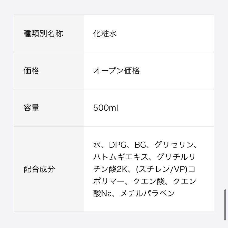 - <通常サイズ 500ml> 水、DPG、BG、グリセリン、ハトムギエキス、グリチルリチン酸2K、(スチレン/VP)コポリマー、クエン酸、クエン酸Na、メチルパラベン <500ml+ 限定ムーミンデザインボトル> 水、DPG、BG、グリセリン、ハトムギエキス、グリチルリチン酸2K、(スチレン/VP)コポリマー、クエン酸、クエン酸Na、メチルパラベン <詰め替えタイプ 480ml> 水、DPG、BG、グリセリン、ハトムギエキス、グリチルリチン酸2K、(スチレン/VP)コポリマー、クエン酸、クエン酸Na、メチルパラベン <旧製品> BG、グリセリン、メチルパラベン、エタノール、グリチルリチン酸2K、ハトムギエキス、DPG、クエン酸Na、プロピルパラベン、クエン酸、(スチレン/アクリレーツ)コポリマー、水 <限定ムーミンデザイン> 水、DPG、BG、グリセリン、ハトムギエキス、グリチルリチン酸2K、(スチレン/VP)コポリマー、クエン酸、クエン酸Na、メチルパラベン