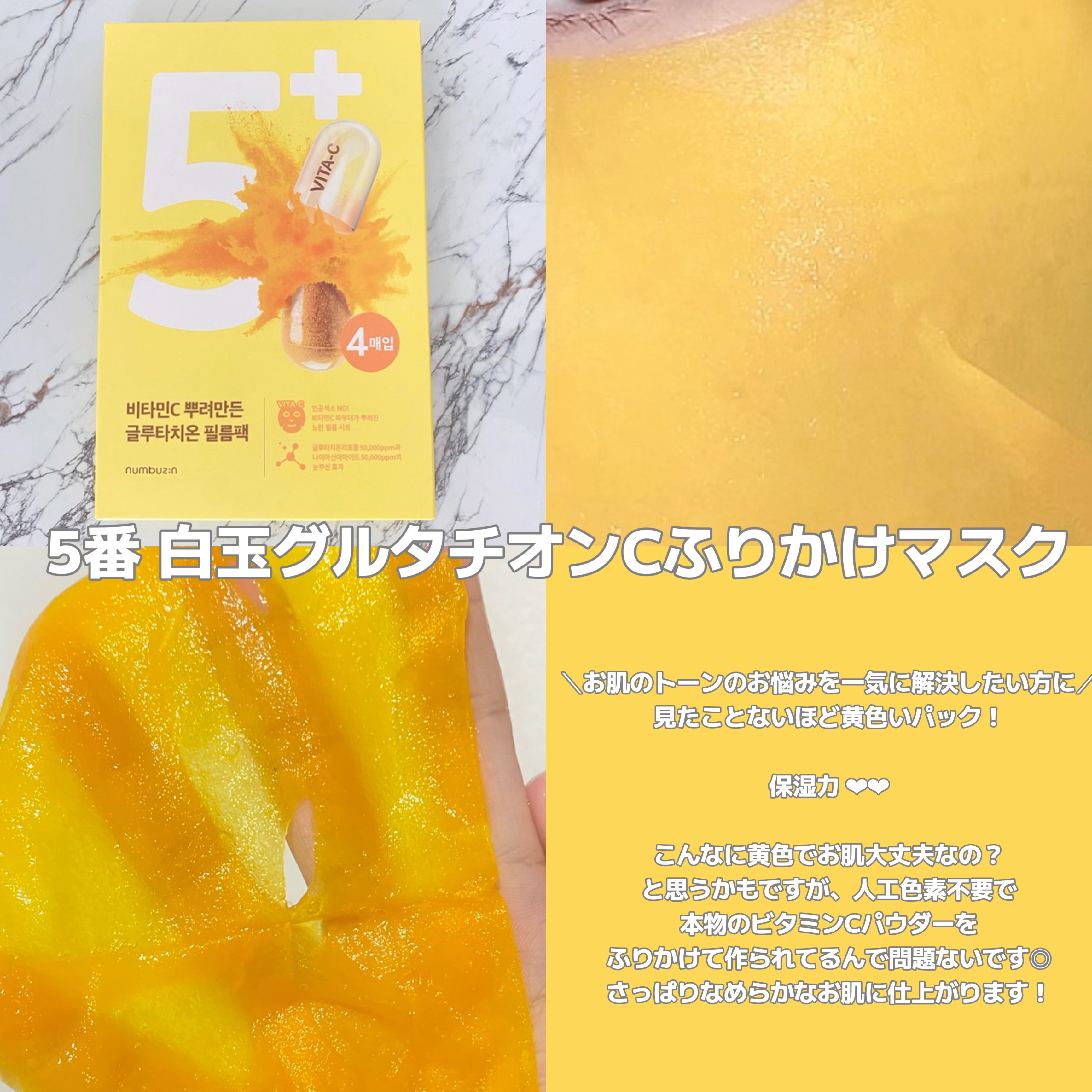 No.1💚 保湿・鎮静ケア ねばーっとしたテクスチャーにびっくり さっぱりだけどしっかり保湿される感じ🌿 No.3🤎 毛穴・肌のキメ ガラクトミセスやビフィズス菌の発酵成分が入ってるらしい 香りが独特です!すべすべ感のある肌になる感じ🩰 No.5💛 美白ケア バズってた5番のパック ビタミンCをふりかけたシートとのこと🍋 顔色トーンアップするような感じ✨