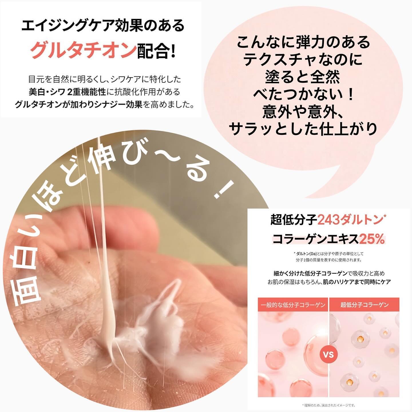 - 女性のお肌の悩みに集中アプローチ! 超低分子コラーゲンを配合した、もちもちと伸びるクリームが効率よくお肌に浸透し弾力不足に悩むお肌を助けます。 しっかりと保湿しながらもべたつかず、シルクの膜をまとったかのようなつるんとしたお肌に仕上がります。