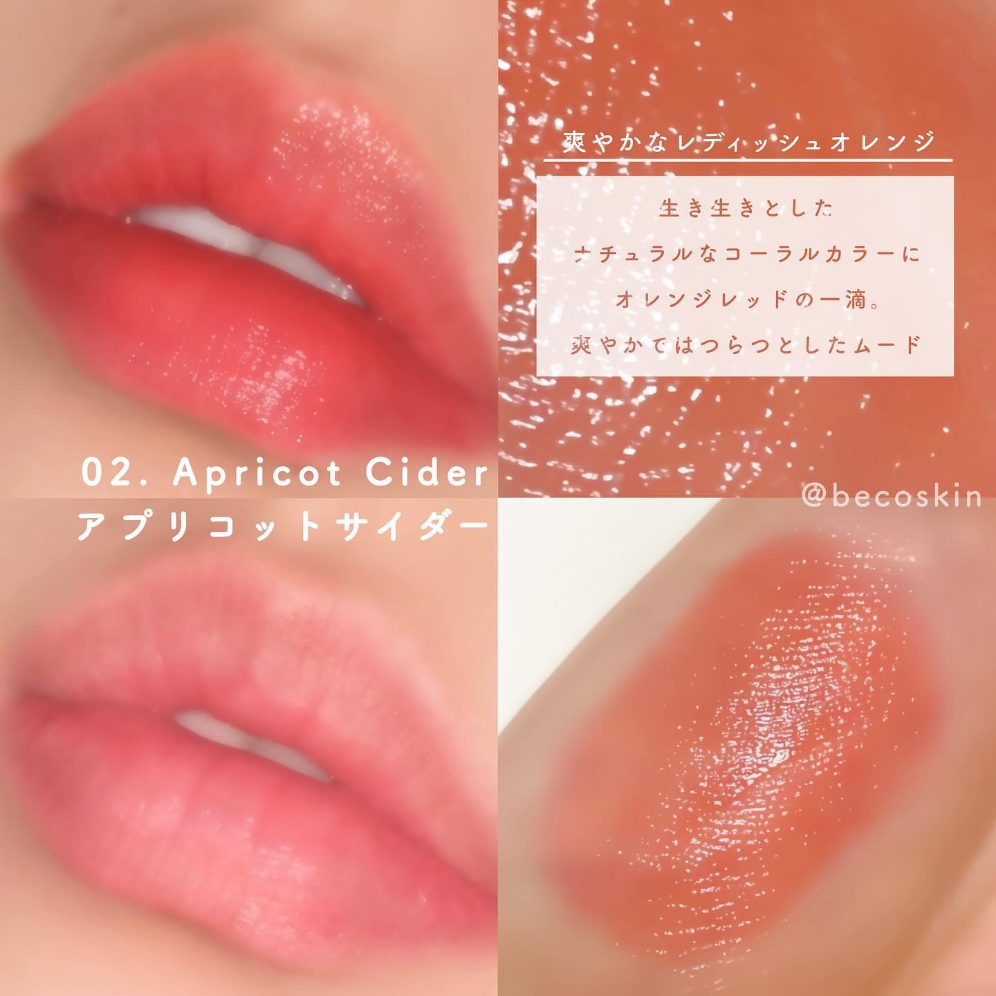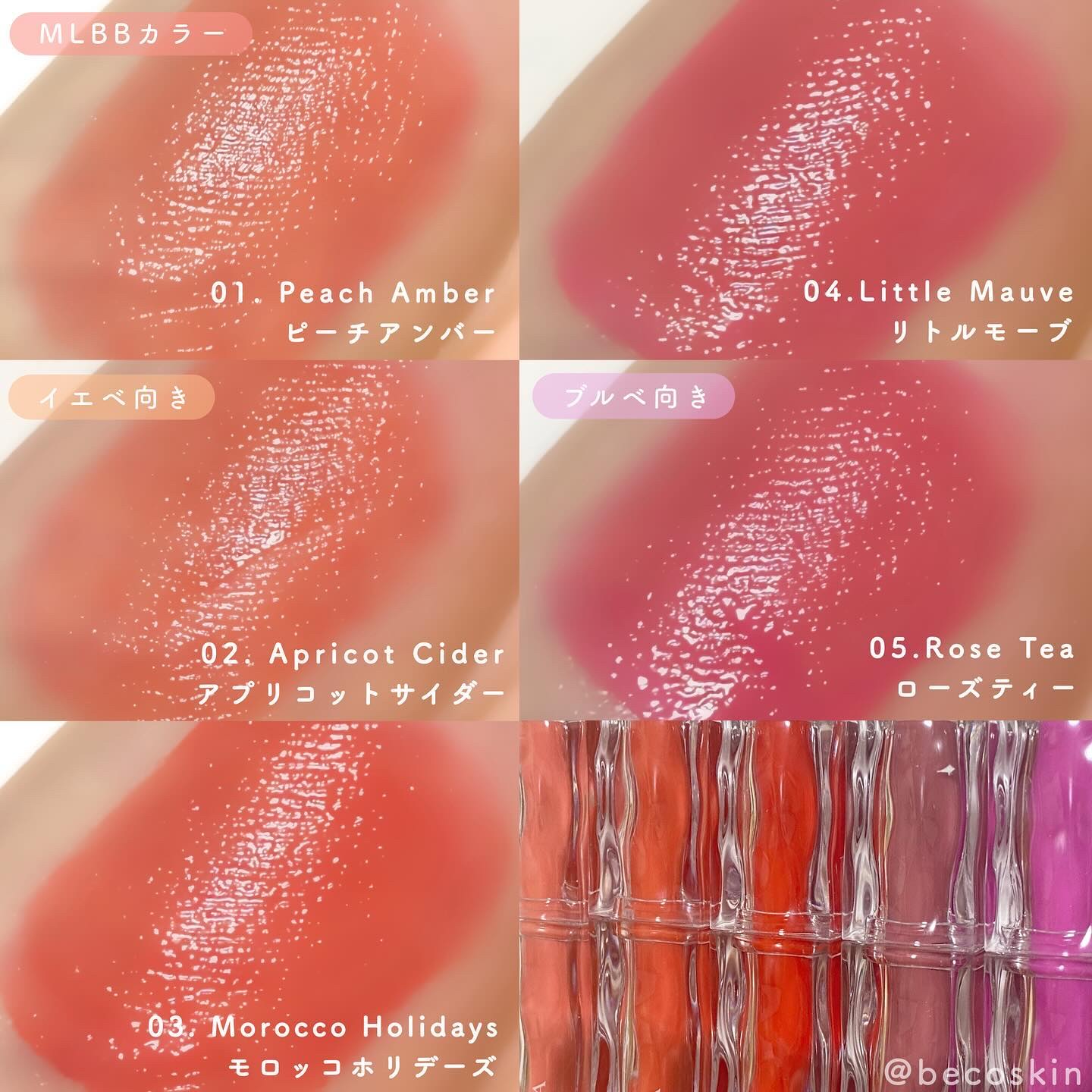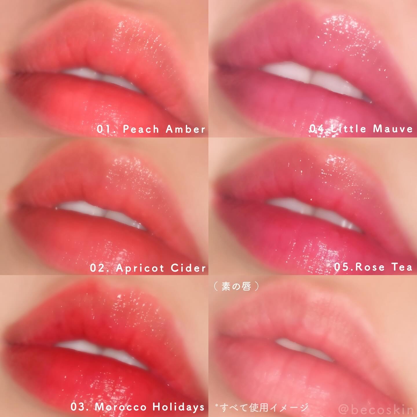 - <01. ピーチアンバー> 水、リンゴ酸ジイソステアリル、ビスジグリセリルポリアシルアジペート-2、ジフェニルシロキシフェニルトリメチコン、ジフェニルジメチコン、水添ポリイソブテン、BG、グリセリン、1,2-ヘキサンジオール、セテアレス-20、セテアリルアルコール、セチルPEG/PPG-10/1ジメチコン、(アクリル酸ヒドロキシエチル/アクリロイルジメチルタウリンNa)コポリマー、ポリソルベート60、フェノキシエタノール、スクワラン、香料、エチルヘキシルグリセリン、EDTA-2Na、イソステアリン酸ソルビタン、水酸化Al、ポリアクリル酸アンモニウム、ホホバ種子油、月見草油、アボカド油、モモ果実エキス、ステアリン酸Na、クエン酸、テトラ(ジ-t-ブチルヒドロキシヒドロケイヒ酸)ペンタエリスリチル、クダモノトケイソウ果実エキス、ヤエヤマアオキ果実エキス、ミルシアリアデュビア果実エキス、アンマロク果実エキス、ヒポファエラムノイデス果実エキス、テルミナリアフェルジナンジアナ果実エキス、酸化チタン、黄5、赤227、赤104(1)、黄4、青1 <02.アプリコットサイダー> 水、リンゴ酸ジイソステアリル、ビスジグリセリルポリアシルアジペート-2、ジフェニルシロキシフェニルトリメチコン、水添ポリイソブテン、ジフェニルジメチコン、BG、グリセリン、1,2-ヘキサンジオール、セテアレス-20、セテアリルアルコール、セチルPEG/PPG-10/1ジメチコン、(アクリル酸ヒドロキシエチル/アクリロイルジメチルタウリンNa)コポリマー、ポリソルベート60、フェノキシエタノール、スクワラン、香料、エチルヘキシルグリセリン、EDTA-2Na、イソステアリン酸ソルビタン、アボカド油、ホホバ種子油、月見草油、モモ果実エキス、ステアリン酸Na、クエン酸、テトラ(ジ-t-ブチルヒドロキシヒドロケイヒ酸)ペンタエリスリチル、アンマロク果実エキス、クダモノトケイソウ果実エキス、ヒポファエラムノイデス果実エキス、テルミナリアフェルジナンジアナ果実エキス、ヤエヤマアオキ果実エキス、ミルシアリアデュビア果実エキス、酸化チタン、黄5、赤227、赤104(1)、青1 <03.モロッコホリデーズ> 水、リンゴ酸ジイソステアリル、ビスジグリセリルポリアシルアジペート-2、ジフェニルシロキシフェニルトリメチコン、ジフェニルジメチコン、水添ポリイソブテン、BG、グリセリン、1,2-ヘキサンジオール、セテアレス-20、セテアリルアルコール、セチルPEG/PPG-10/1ジメチコン、(アクリル酸ヒドロキシエチル/アクリロイルジメチルタウリンNa)コポリマー、ポリソルベート60、フェノキシエタノール、スクワラン、香料、エチルヘキシルグリセリン、EDTA-2Na、イソステアリン酸ソルビタン、水酸化Al、ポリアクリル酸アンモニウム、ホホバ種子油、月見草油、アボカド油、モモ果実エキス、ステアリン酸Na、クエン酸、テトラ(ジ-t-ブチルヒドロキシヒドロケイヒ酸)ペンタエリスリチル、クダモノトケイソウ果実エキス、ヤエヤマアオキ果実エキス、ミルシアリアデュビア果実エキス、アンマロク果実エキス、ヒポファエラムノイデス果実エキス、テルミナリアフェルジナンジアナ果実エキス、酸化チタン、黄5、赤227、赤104(1)、青1、黄4 <04. リトルモーブ> 水、リンゴ酸ジイソステアリル、ビスジグリセリルポリアシルアジペート-2、ジフェニルシロキシフェニルトリメチコン、ジフェニルジメチコン、水添ポリイソブテン、BG、グリセリン、1,2-ヘキサンジオール、セテアレス-20、セテアリルアルコール、セチルPEG/PPG-10/1ジメチコン、(アクリル酸ヒドロキシエチル/アクリロイルジメチルタウリンNa)コポリマー、ポリソルベート60、フェノキシエタノール、スクワラン、香料、エチルヘキシルグリセリン、EDTA-2Na、イソステアリン酸ソルビタン、水酸化Al、ポリアクリル酸アンモニウム、ホホバ種子油、月見草油、アボカド油、モモ果実エキス、ステアリン酸Na、クエン酸、テトラ(ジ-t-ブチルヒドロキシヒドロケイヒ酸)ペンタエリスリチル、クダモノトケイソウ果実エキス、ヤエヤマアオキ果実エキス、ミルシアリアデュビア果実エキス、アンマロク果実エキス、ヒポファエラムノイデス果実エキス、テルミナリアフェルジナンジアナ果実エキス、酸化チタン、赤227、赤104(1)、黄5、黄4、青1 <05.ローズティー> 水、リンゴ酸ジイソステアリル、ビスジグリセリルポリアシルアジペート-2、ジフェニルシロキシフェニルトリメチコン、ジフェニルジメチコン、水添ポリイソブテン、BG、グリセリン、1,2-ヘキサンジオール、セテアレス-20、セテアリルアルコール、セチルPEG/PPG-10/1ジメチコン、(アクリル酸ヒドロキシエチル/アクリロイルジメチルタウリンNa)コポリマー、ポリソルベート60、フェノキシエタノール、スクワラン、香料、エチルヘキシルグリセリン、EDTA-2Na、イソステアリン酸ソルビタン、水酸化Al、ポリアクリル酸アンモニウム、ホホバ種子油、月見草油、アボカド油、モモ果実エキス、ステアリン酸Na、クエン酸、テトラ(ジ-t-ブチルヒドロキシヒドロケイヒ