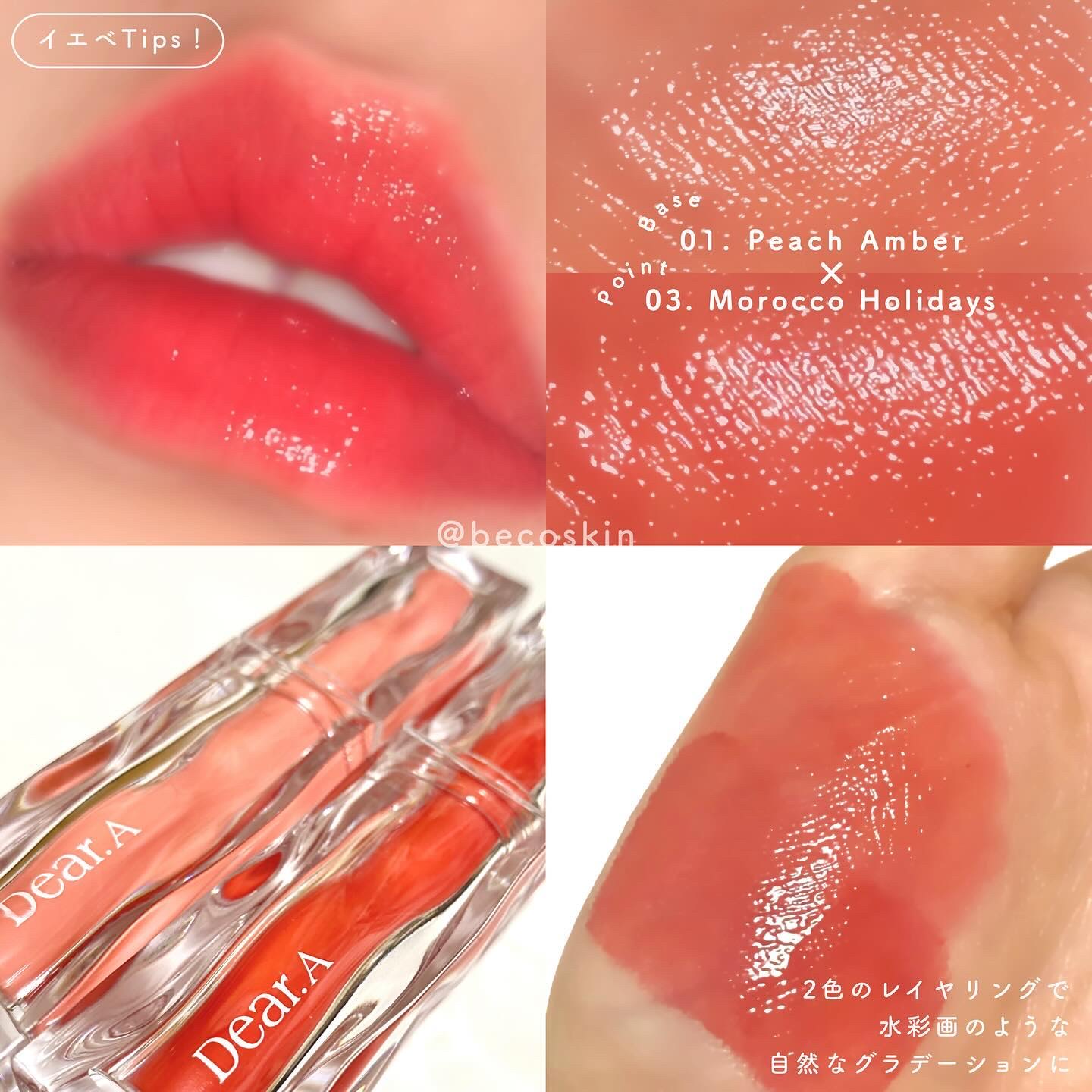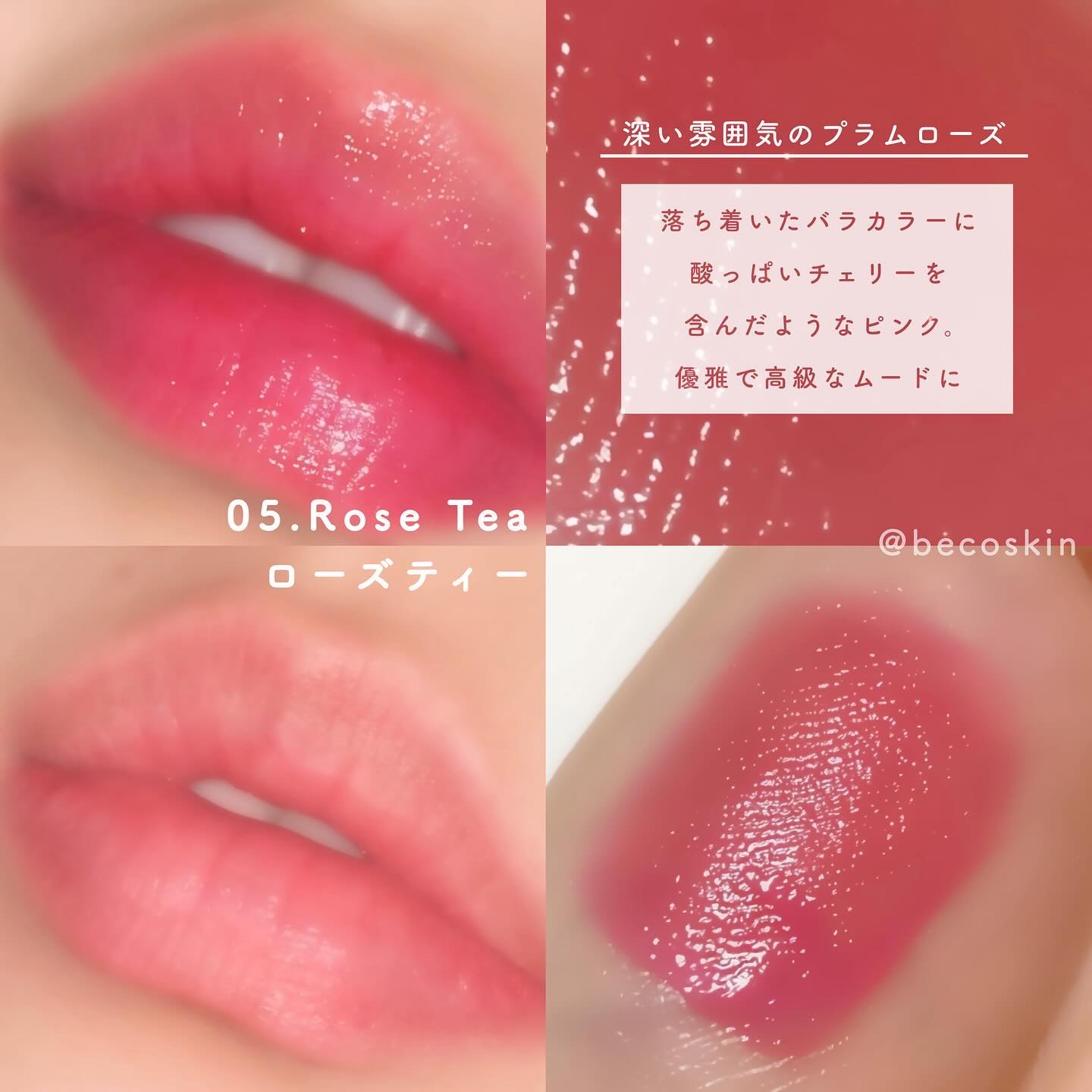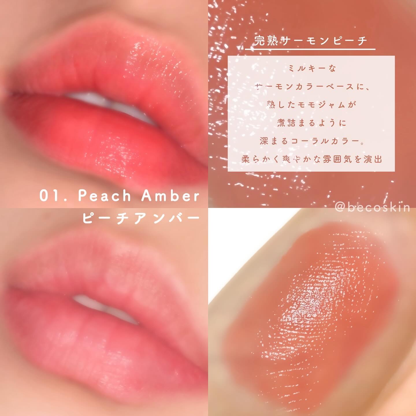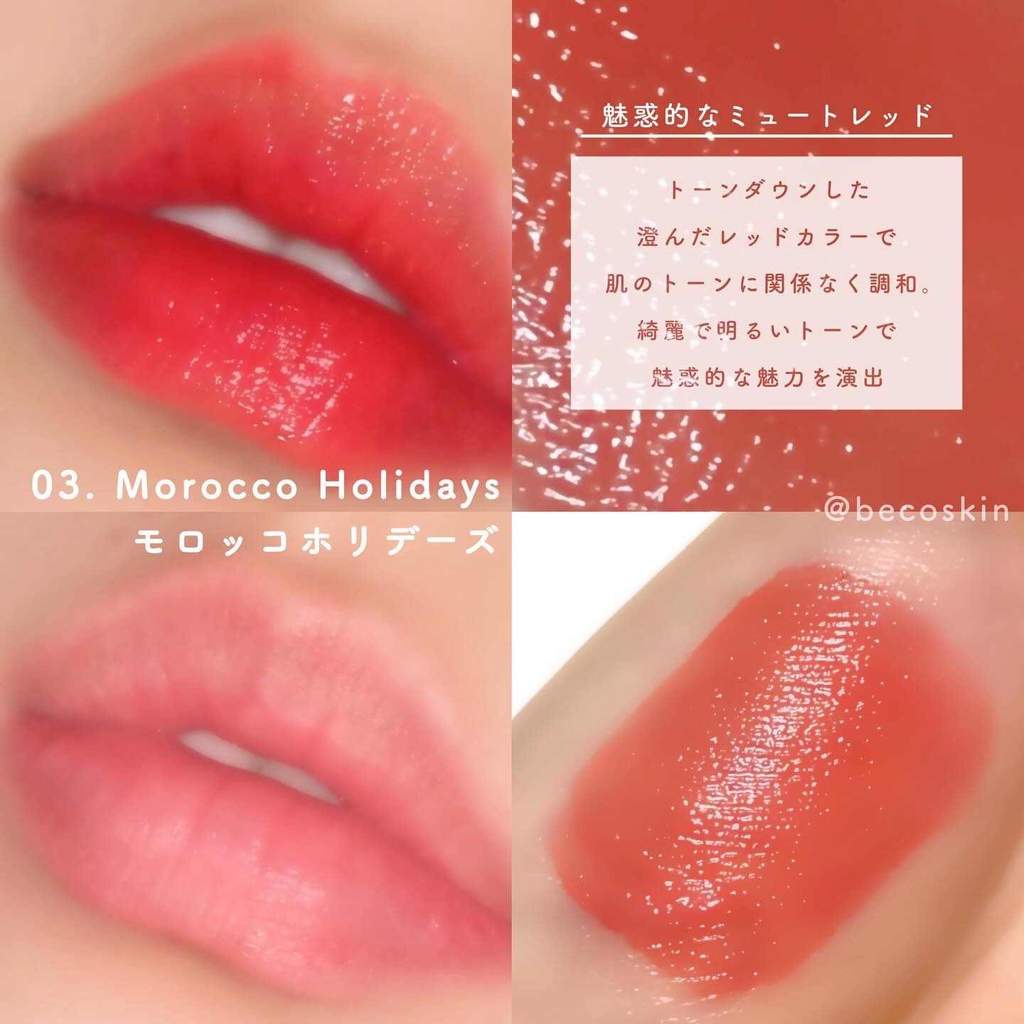 - <01. ピーチアンバー> 水、リンゴ酸ジイソステアリル、ビスジグリセリルポリアシルアジペート-2、ジフェニルシロキシフェニルトリメチコン、ジフェニルジメチコン、水添ポリイソブテン、BG、グリセリン、1,2-ヘキサンジオール、セテアレス-20、セテアリルアルコール、セチルPEG/PPG-10/1ジメチコン、(アクリル酸ヒドロキシエチル/アクリロイルジメチルタウリンNa)コポリマー、ポリソルベート60、フェノキシエタノール、スクワラン、香料、エチルヘキシルグリセリン、EDTA-2Na、イソステアリン酸ソルビタン、水酸化Al、ポリアクリル酸アンモニウム、ホホバ種子油、月見草油、アボカド油、モモ果実エキス、ステアリン酸Na、クエン酸、テトラ(ジ-t-ブチルヒドロキシヒドロケイヒ酸)ペンタエリスリチル、クダモノトケイソウ果実エキス、ヤエヤマアオキ果実エキス、ミルシアリアデュビア果実エキス、アンマロク果実エキス、ヒポファエラムノイデス果実エキス、テルミナリアフェルジナンジアナ果実エキス、酸化チタン、黄5、赤227、赤104(1)、黄4、青1 <02.アプリコットサイダー> 水、リンゴ酸ジイソステアリル、ビスジグリセリルポリアシルアジペート-2、ジフェニルシロキシフェニルトリメチコン、水添ポリイソブテン、ジフェニルジメチコン、BG、グリセリン、1,2-ヘキサンジオール、セテアレス-20、セテアリルアルコール、セチルPEG/PPG-10/1ジメチコン、(アクリル酸ヒドロキシエチル/アクリロイルジメチルタウリンNa)コポリマー、ポリソルベート60、フェノキシエタノール、スクワラン、香料、エチルヘキシルグリセリン、EDTA-2Na、イソステアリン酸ソルビタン、アボカド油、ホホバ種子油、月見草油、モモ果実エキス、ステアリン酸Na、クエン酸、テトラ(ジ-t-ブチルヒドロキシヒドロケイヒ酸)ペンタエリスリチル、アンマロク果実エキス、クダモノトケイソウ果実エキス、ヒポファエラムノイデス果実エキス、テルミナリアフェルジナンジアナ果実エキス、ヤエヤマアオキ果実エキス、ミルシアリアデュビア果実エキス、酸化チタン、黄5、赤227、赤104(1)、青1 <03.モロッコホリデーズ> 水、リンゴ酸ジイソステアリル、ビスジグリセリルポリアシルアジペート-2、ジフェニルシロキシフェニルトリメチコン、ジフェニルジメチコン、水添ポリイソブテン、BG、グリセリン、1,2-ヘキサンジオール、セテアレス-20、セテアリルアルコール、セチルPEG/PPG-10/1ジメチコン、(アクリル酸ヒドロキシエチル/アクリロイルジメチルタウリンNa)コポリマー、ポリソルベート60、フェノキシエタノール、スクワラン、香料、エチルヘキシルグリセリン、EDTA-2Na、イソステアリン酸ソルビタン、水酸化Al、ポリアクリル酸アンモニウム、ホホバ種子油、月見草油、アボカド油、モモ果実エキス、ステアリン酸Na、クエン酸、テトラ(ジ-t-ブチルヒドロキシヒドロケイヒ酸)ペンタエリスリチル、クダモノトケイソウ果実エキス、ヤエヤマアオキ果実エキス、ミルシアリアデュビア果実エキス、アンマロク果実エキス、ヒポファエラムノイデス果実エキス、テルミナリアフェルジナンジアナ果実エキス、酸化チタン、黄5、赤227、赤104(1)、青1、黄4 <04. リトルモーブ> 水、リンゴ酸ジイソステアリル、ビスジグリセリルポリアシルアジペート-2、ジフェニルシロキシフェニルトリメチコン、ジフェニルジメチコン、水添ポリイソブテン、BG、グリセリン、1,2-ヘキサンジオール、セテアレス-20、セテアリルアルコール、セチルPEG/PPG-10/1ジメチコン、(アクリル酸ヒドロキシエチル/アクリロイルジメチルタウリンNa)コポリマー、ポリソルベート60、フェノキシエタノール、スクワラン、香料、エチルヘキシルグリセリン、EDTA-2Na、イソステアリン酸ソルビタン、水酸化Al、ポリアクリル酸アンモニウム、ホホバ種子油、月見草油、アボカド油、モモ果実エキス、ステアリン酸Na、クエン酸、テトラ(ジ-t-ブチルヒドロキシヒドロケイヒ酸)ペンタエリスリチル、クダモノトケイソウ果実エキス、ヤエヤマアオキ果実エキス、ミルシアリアデュビア果実エキス、アンマロク果実エキス、ヒポファエラムノイデス果実エキス、テルミナリアフェルジナンジアナ果実エキス、酸化チタン、赤227、赤104(1)、黄5、黄4、青1 <05.ローズティー> 水、リンゴ酸ジイソステアリル、ビスジグリセリルポリアシルアジペート-2、ジフェニルシロキシフェニルトリメチコン、ジフェニルジメチコン、水添ポリイソブテン、BG、グリセリン、1,2-ヘキサンジオール、セテアレス-20、セテアリルアルコール、セチルPEG/PPG-10/1ジメチコン、(アクリル酸ヒドロキシエチル/アクリロイルジメチルタウリンNa)コポリマー、ポリソルベート60、フェノキシエタノール、スクワラン、香料、エチルヘキシルグリセリン、EDTA-2Na、イソステアリン酸ソルビタン、水酸化Al、ポリアクリル酸アンモニウム、ホホバ種子油、月見草油、アボカド油、モモ果実エキス、ステアリン酸Na、クエン酸、テトラ(ジ-t-ブチルヒドロキシヒドロケイヒ