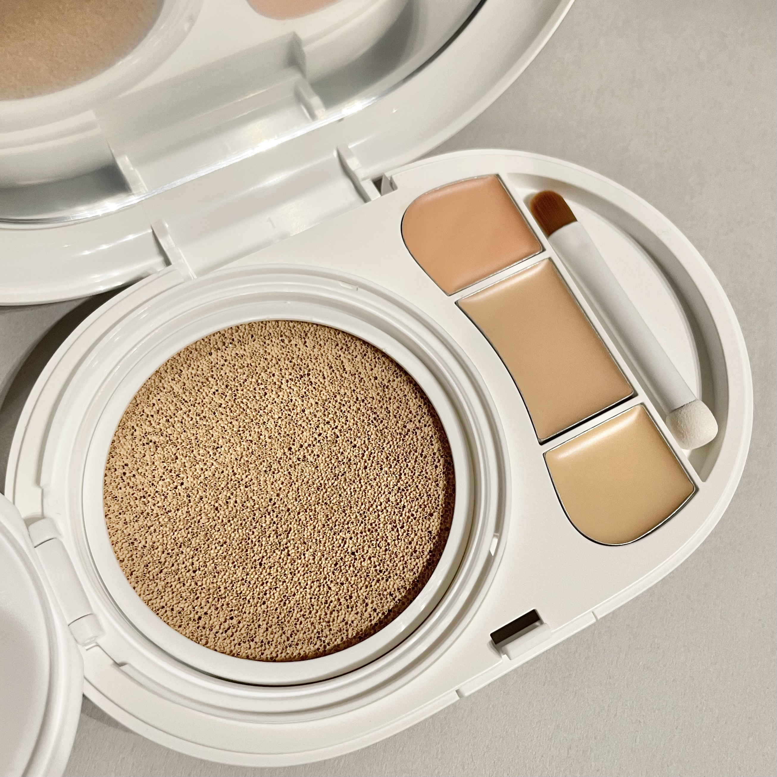 - SPF50+・PA+++ クッションファンデーションは、セミマットなテクスチャーが素肌にしっかり密着し、高いカバー力でも厚塗り感なく仕上がります。 また保湿力に優れた4種類のオイル成分を配合し、うるおいを保ちながら自然な仕上がりを24時間キープします。 さらに、クマ、シミ、そばかす、ニキビ跡などの人によって異なる肌悩みも思い通りにカバーできるよう、カラーやテクスチャーをこだわり抜いた3色のコンシーラーがセットになっています。