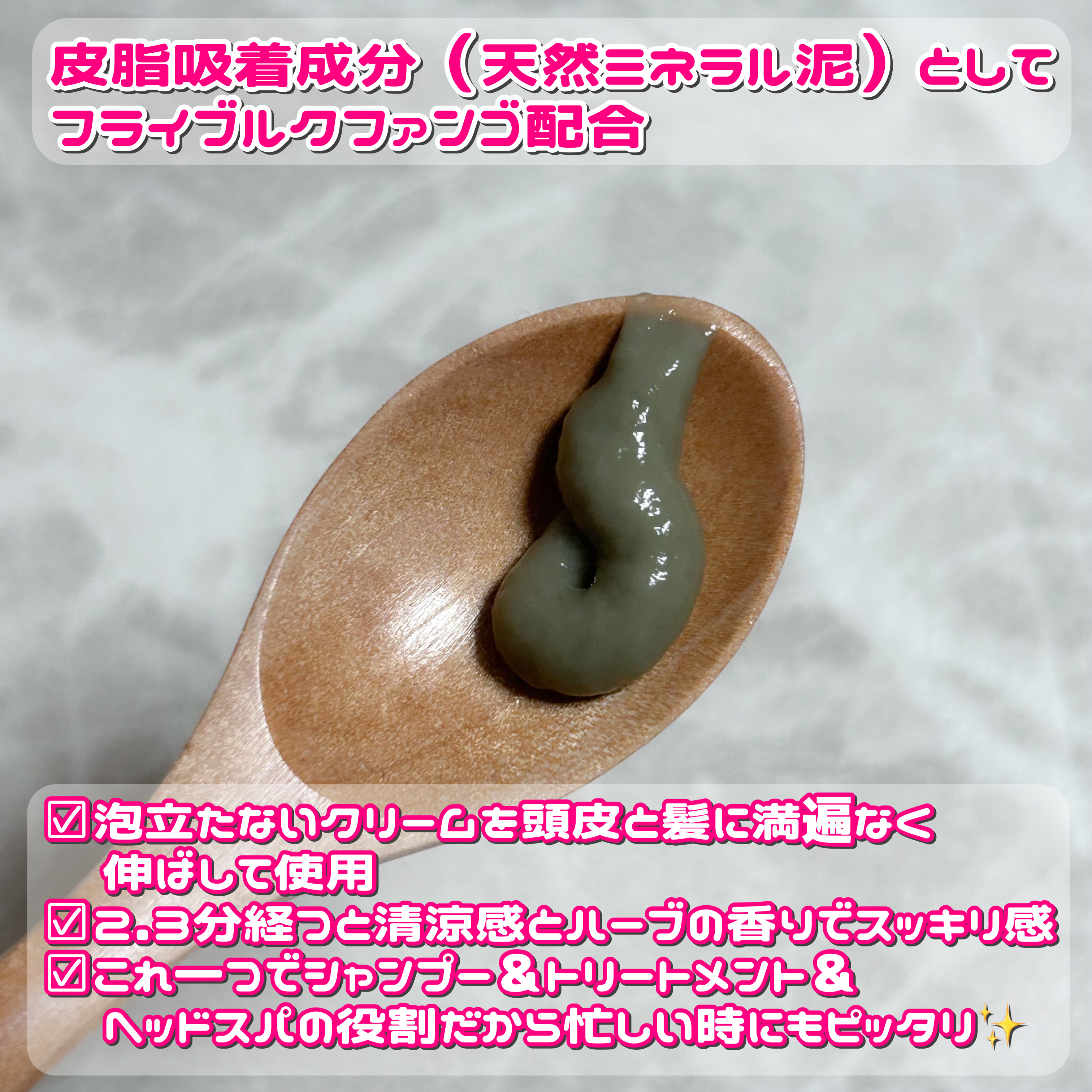 - ● 天然ミネラル泥配合。頭皮ケア、シャンプー、トリートメントの3つの機能を凝縮した、贅沢ヘッドスパクリームです。 ● 泡立たない濃厚クリームがなめらかにのび広がりながら密着し、頭皮や毛穴のよごれをすっきり落とします。 マッサージで頭皮の血行を促進し、ハリコシのある健やかな髪に導きます。 ● 海洋由来成分とハーブをふんだんに配合。健やかな毛髪が生まれる頭皮環境を整え、芯からしなやかでハリのある美しい髪に導きます。 ● シャンプーとは一味違う、よごれ落ち。 クレンジング成分&2種の泥成分(フライブルクファンゴ、海洋性泥抽出エキス)が、頭皮や毛髪のよごれはもちろん、毛穴の皮脂づまりまでもしっかりからめ取り、すっきりと洗いあげます。 ● 軽いオイルを厳選して配合し、髪質や長さを問わず根もとからふんわりとした立ち上がりを叶え、自然なハリコシやツヤがあり、つるつるなめらかな手触りの髪へ。 トリートメント効果で毛髪を健やかに整え、ダメージを受けにくい、まとまり感のあるツヤ髪に導きます。 ● 一度使うとやみつきのヘッドスパ感触。頭皮や髪への密着感の高いベースでのび広がりが良く、頭皮までしっかり届く、使いやすいテクスチャー。 濃厚クリームに包まれながら贅沢気分でマッサージすることができます。ひんやりジンジンとした清涼感で、使用中から効果感を実感できます。 ● 健康な毛髪の表面に存在し、指通りやツヤ感にとって重要な18-MEA と構造が類似したコンディショニングオイルを配合。 指通りなめらかな、根もとはふんわりハリコシのある、イキイキとしたツヤ髪へ導きます。 ● すっきりとしたリフレッシュ感のあるハーバルグリーンフローラルの香り。 ● ノンシリコーン処方、鉱物油フリー