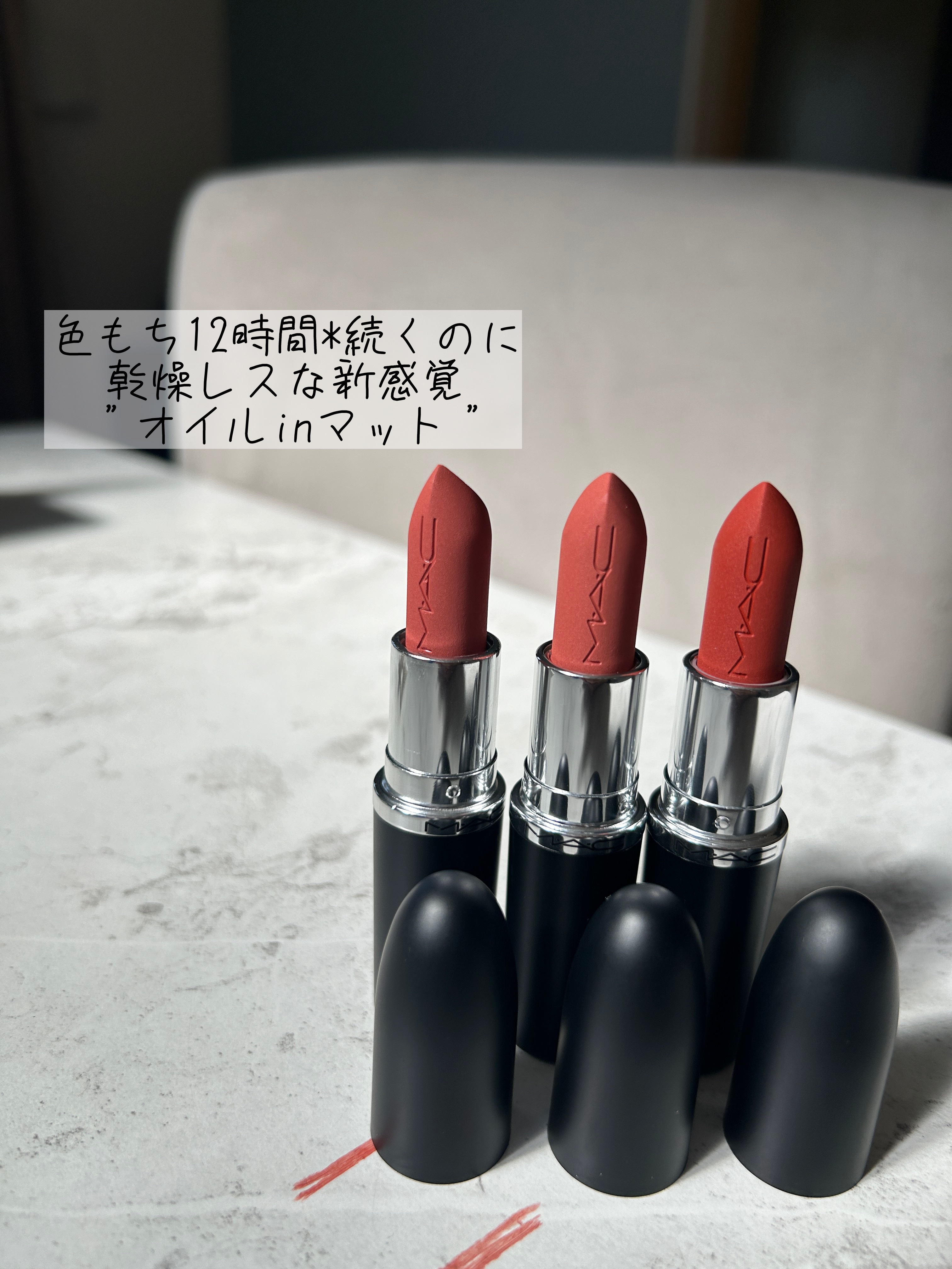 - <価格改定>2025年7月1日より¥4,620(税込)から¥4,400(税込)に改定いたします。 マットリップはここまで進化。 色もち12時間*続くのに乾燥レスな新感覚 ”オイルinマット” M・A・Cのマキシマル誕生。 毎日つけたくなるような、 バームのようななめらかな質感とつけ心地が12時間持続*。 ありのままの自分から、 さらに一歩先へ踏み出せるような自信を唇に *化粧持ち(色持ち)データ取得済み。(当社調べ。効果には個人差があります。) ①リッチな発色とカラーラインナップ M・A・C独自のテクノロジー、リッチピグメントフォーミュラにより鮮やかな発色を実現。 人気色を継続しながらも、新たにアーティストが厳選した25シェードは、 一人一人の個性やスタイル、魅力を高め、存在感を放つit カラーをラインナップ。 ②ストレスフリーなつけ心地 マットテクスチャー=乾燥しやすいというネガティブイメージを払拭する、オイル in マット フォーミュラ。 自然由来のオーガニックのシアバター、ココアバター、ココナッツオイル配合**で濃密な潤いを与え、驚きのなめらかな付け心地とフィット感を叶えた。 香りは、シグネチャーであるバニラを継続。 **シアバター:シア脂(保湿成分) 、ココアバター:カカオ脂(保湿成分) 、ココナッツオイル:ヤシ油(保湿成分) ③12時間持続*というラスティング力 ピタリと唇に密着しながらもしなやかに寄り添い、鮮やかな発色、つけ心地が12時間*持続。 唇をティントのように染めずに、それでいてどんな瞬間も自信の持てる唇に。 *化粧もちデータ取得済み (当社調べ、効果には個人差があります) ④魅力的な新パッケージ 再生プラスチックを約30%採用した、環境にやさしい新パッケージへとパワーアップ。 程よく重厚感のある感触はラグジュアリーな気持ちを高めてくれる。 また、リップにはM・A・Cのエンボス加工も。