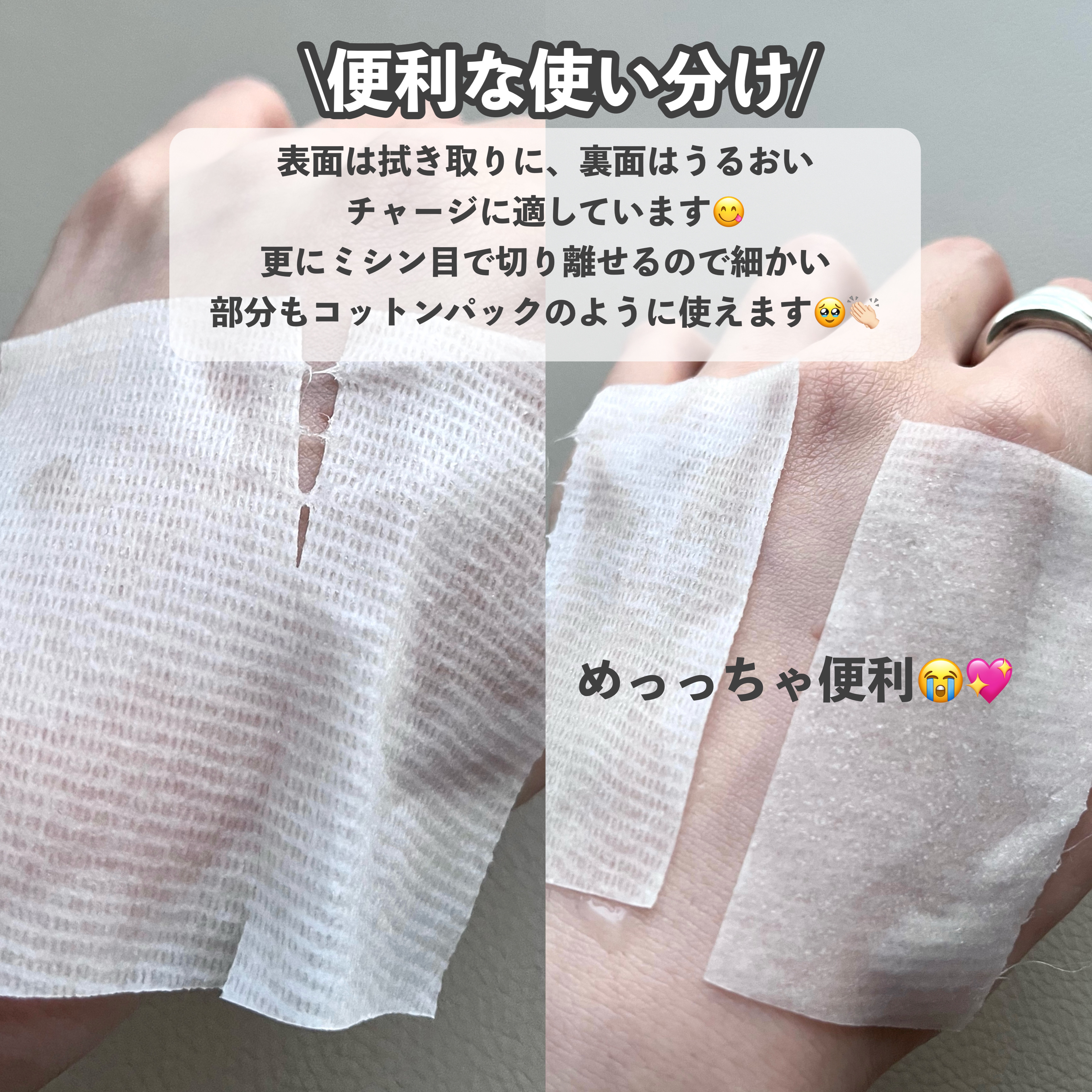 真ん中に点線があり半分にちぎることができます! 鼻やおでこ、あごなど半分にしてパックできるのがとても良かったです! ソフト面のほうは肌に優しく日々のスキンケアができて、デコボコ面は細かい凹凸で古い角質を取ることができるそうです! 刺激を感じたりなどがなかったです!