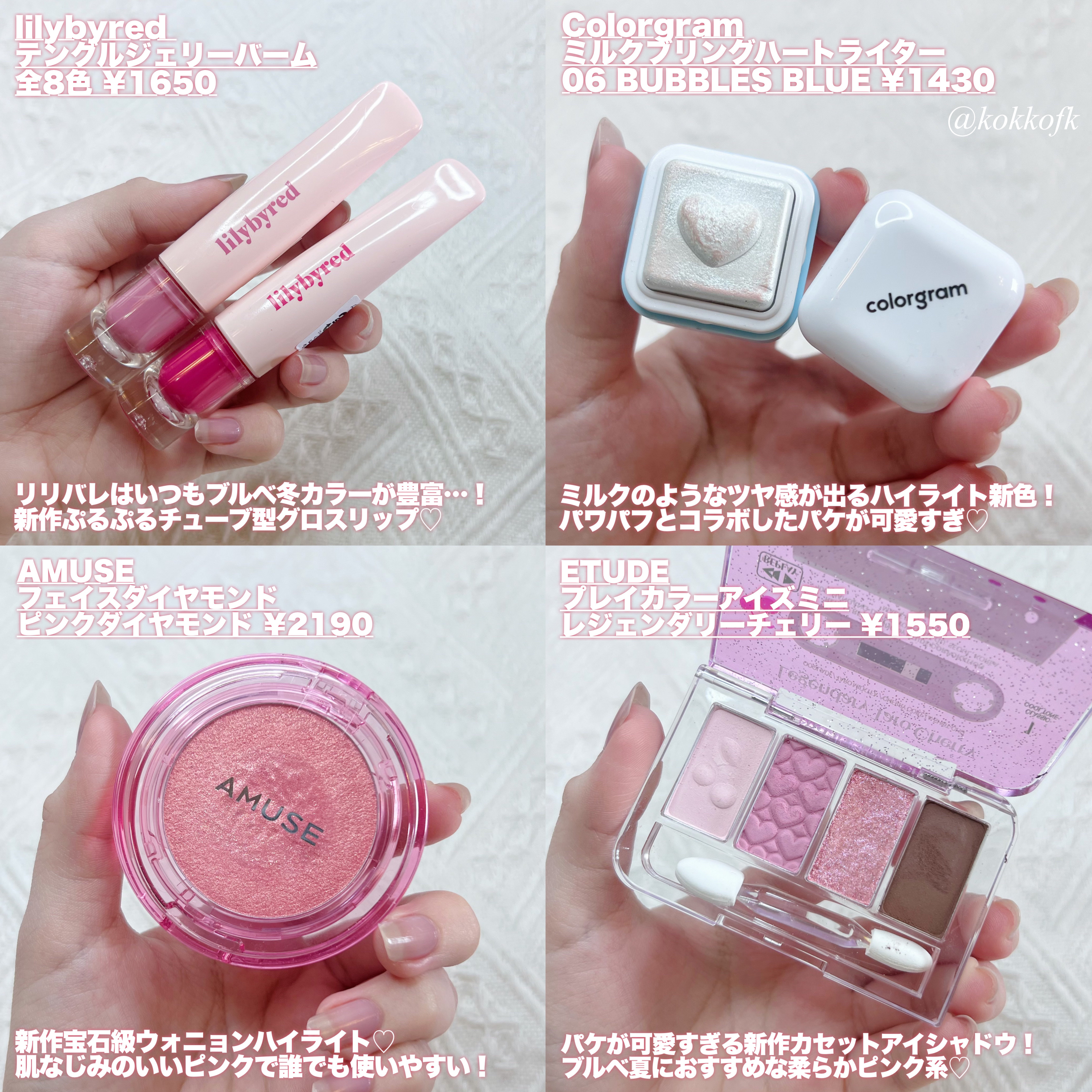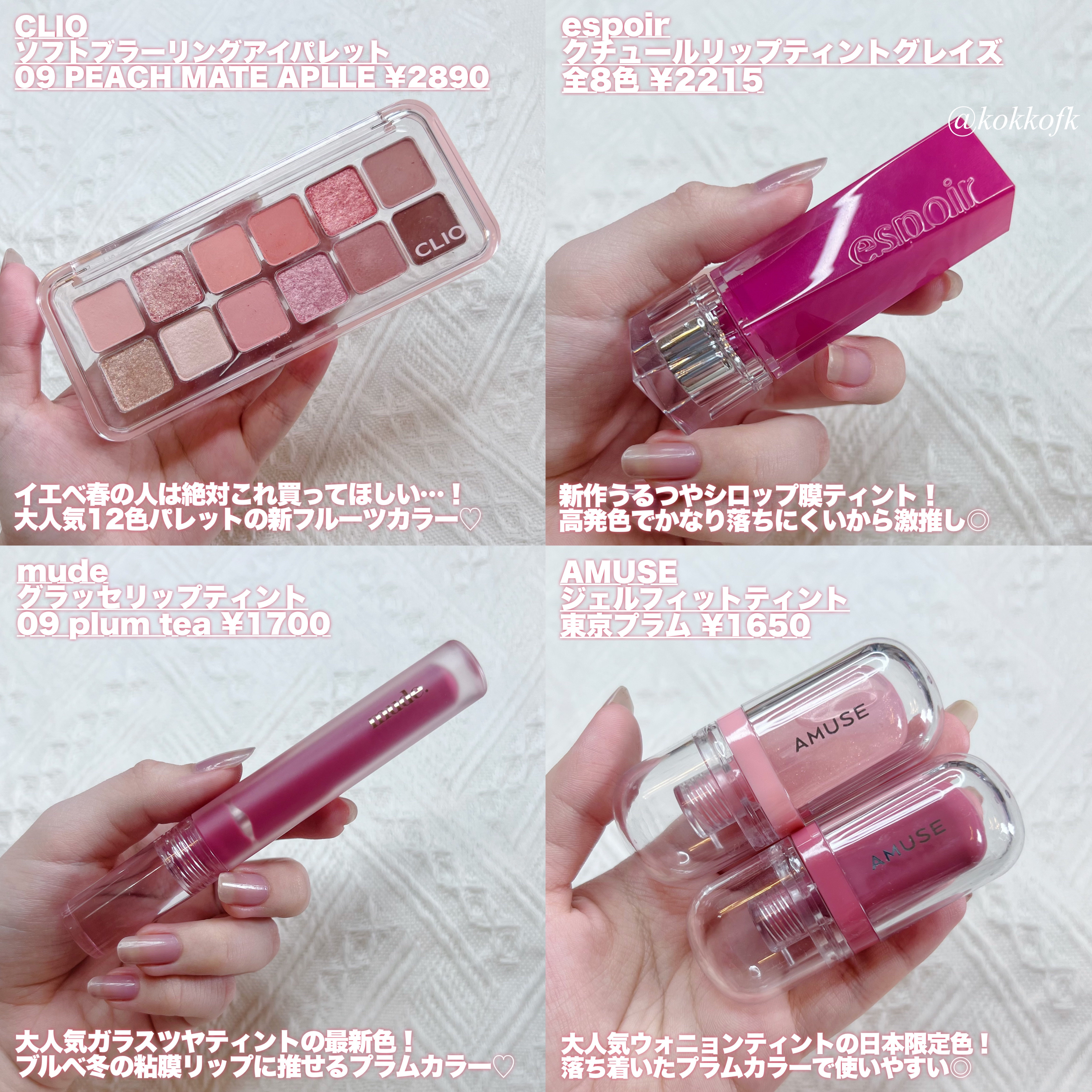 rom&nd────────────ベターザンパレット06 PEONY NUDE GARDEN (¥2900) rom&nd────────────ベターザンアイズ W03 Dry Strawberry (¥1569) HOLIKA HOLIKA────────────マイフェブムードアイパレットMOONY (¥2050) HOLIKA HOLIKA────────────マイフェブムードアイパレットPINK OLOGY (¥2050) CLIO────────────プロ アイ パレット13 PICNIC BY THE SUNSET (¥2390) PERIPERA────────────オール テイク ムード パレット04 MUTEFUL ROSE (¥1590) PERIPERA────────────オール テイク ムード パレット09 MOONLIKE LAVENDER PINK (¥1590) PERIPERA────────────インク ポケット シャドウ パレット05 TOUCHING TARO STARS (¥1190)