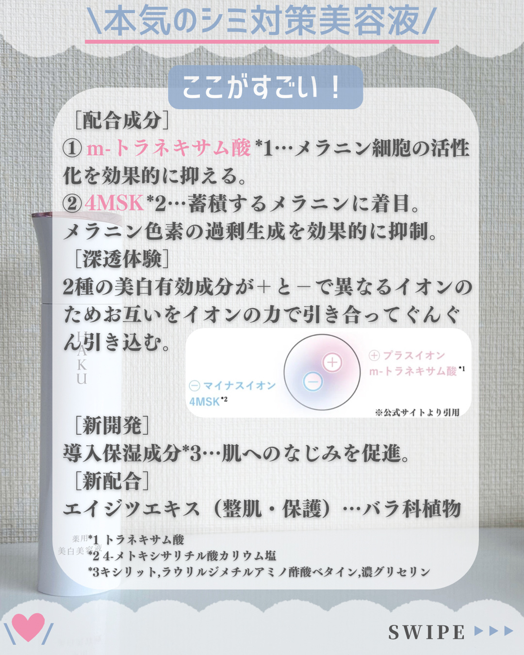 - <本体(45g)> 有効成分 4-メトキシサリチル酸カリウム塩、トラネキサム酸 その他の成分 キシリット、ラウリルジメチルアミノ酢酸ベタイン、エイジツエキス、無水ケイ酸、L-セリン、アセチル化ヒアルロン酸ナトリウム、オトギリソウエキス、イチヤクソウエキス、トルメンチラエキス、ユリエキス、塩酸グルコサミン、濃グリセリン、ヨモギエキス(2)、2-O-エチル-L-アスコルビン酸、精製水、ジプロピレングリコール、ベヘニルアルコール、エタノール、メチルポリシロキサン、ピバリン酸イソデシル、N-ステアロイル-N-メチルタウリンナトリウム、テトライソブタン、α-オレフィンオリゴマー、ワセリン、マルチトール液、ポリエチレングリコール1000、硬化油、ミリスチン酸ミリスチル、ポリオキシエチレン(14)ポリオキシプロピレン(7)ジメチルエーテル、ステアリルアルコール、ポリオキシエチレンベヘニルエーテル、1,3-ブチレングリコール、ステアリン酸ジメチルアミノプロピルアミド、エデト酸二ナトリウム、クエン酸、ジブチルヒドロキシトルエン、l-メントール、水酸化カリウム、クエン酸ナトリウム、無水エタノール、ピロ亜硫酸ナトリウム、フェノキシエタノール <レフィル(45g)> 有効成分 4-メトキシサリチル酸カリウム塩、トラネキサム酸 その他の成分 キシリット、ラウリルジメチルアミノ酢酸ベタイン、エイジツエキス、無水ケイ酸、L-セリン、アセチル化ヒアルロン酸ナトリウム、オトギリソウエキス、イチヤクソウエキス、トルメンチラエキス、ユリエキス、塩酸グルコサミン、濃グリセリン、ヨモギエキス(2)、2-O-エチル-L-アスコルビン酸、精製水、ジプロピレングリコール、ベヘニルアルコール、エタノール、メチルポリシロキサン、ピバリン酸イソデシル、N-ステアロイル-N-メチルタウリンナトリウム、テトライソブタン、α-オレフィンオリゴマー、ワセリン、マルチトール液、ポリエチレングリコール1000、硬化油、ミリスチン酸ミリスチル、ポリオキシエチレン(14)ポリオキシプロピレン(7)ジメチルエーテル、ステアリルアルコール、ポリオキシエチレンベヘニルエーテル、1,3-ブチレングリコール、ステアリン酸ジメチルアミノプロピルアミド、エデト酸二ナトリウム、クエン酸、ジブチルヒドロキシトルエン、l-メントール、水酸化カリウム、クエン酸ナトリウム、無水エタノール、ピロ亜硫酸ナトリウム、フェノキシエタノール <20g> 有効成分 4-メトキシサリチル酸カリウム塩、トラネキサム酸 その他の成分 キシリット、ラウリルジメチルアミノ酢酸ベタイン、エイジツエキス、無水ケイ酸、L-セリン、アセチル化ヒアルロン酸ナトリウム、オトギリソウエキス、イチヤクソウエキス、トルメンチラエキス、ユリエキス、塩酸グルコサミン、濃グリセリン、ヨモギエキス(2)、2-O-エチル-L-アスコルビン酸、精製水、ジプロピレングリコール、ベヘニルアルコール、エタノール、メチルポリシロキサン、ピバリン酸イソデシル、N-ステアロイル-N-メチルタウリンナトリウム、テトライソブタン、α-オレフィンオリゴマー、ワセリン、マルチトール液、ポリエチレングリコール1000、硬化油、ミリスチン酸ミリスチル、ポリオキシエチレン(14)ポリオキシプロピレン(7)ジメチルエーテル、ステアリルアルコール、ポリオキシエチレンベヘニルエーテル、1,3-ブチレングリコール、ステアリン酸ジメチルアミノプロピルアミド、エデト酸二ナトリウム、クエン酸、ジブチルヒドロキシトルエン、l-メントール、水酸化カリウム、クエン酸ナトリウム、無水エタノール、ピロ亜硫酸ナトリウム、フェノキシエタノール <20g(数量限定)> 4-メトキシサリチル酸カリウム塩、トラネキサム酸、キシリット、ラウリルジメチルアミノ酢酸ベタイン、エイジツエキス、無水ケイ酸、L-セリン、アセチル化ヒアルロン酸ナトリウム、オトギリソウエキス、イチヤクソウエキス、トルメンチラエキス、ユリエキス、塩酸グルコサミン、濃グリセリン、ヨモギエキス(2)、2-O-エチル-L-アスコルビン酸、精製水、ジプロピレングリコール、ベヘニルアルコール、エタノール、メチルポリシロキサン、ピバリン酸イソデシル、N-ステアロイル-N-メチルタウリンナトリウム、テトライソブタン、α-オレフィンオリゴマー、ワセリン、マルチトール液、ポリエチレングリコール1000、硬化油、ミリスチン酸ミリスチル、ポリオキシエチレン(14)ポリオキシプロピレン(7)ジメチルエーテル、ステアリルアルコール、ポリオキシエチレンベヘニルエーテル、1,3-ブチレングリコール、ステアリン酸ジメチルアミノプロピルアミド、エデト酸二ナトリウム、クエン酸、ジブチルヒドロキシトルエン、l-メントール、水酸化カリウム、クエン酸ナトリウム、無水エタノール、ピロ亜硫酸ナトリウム、フェノキシエタノール