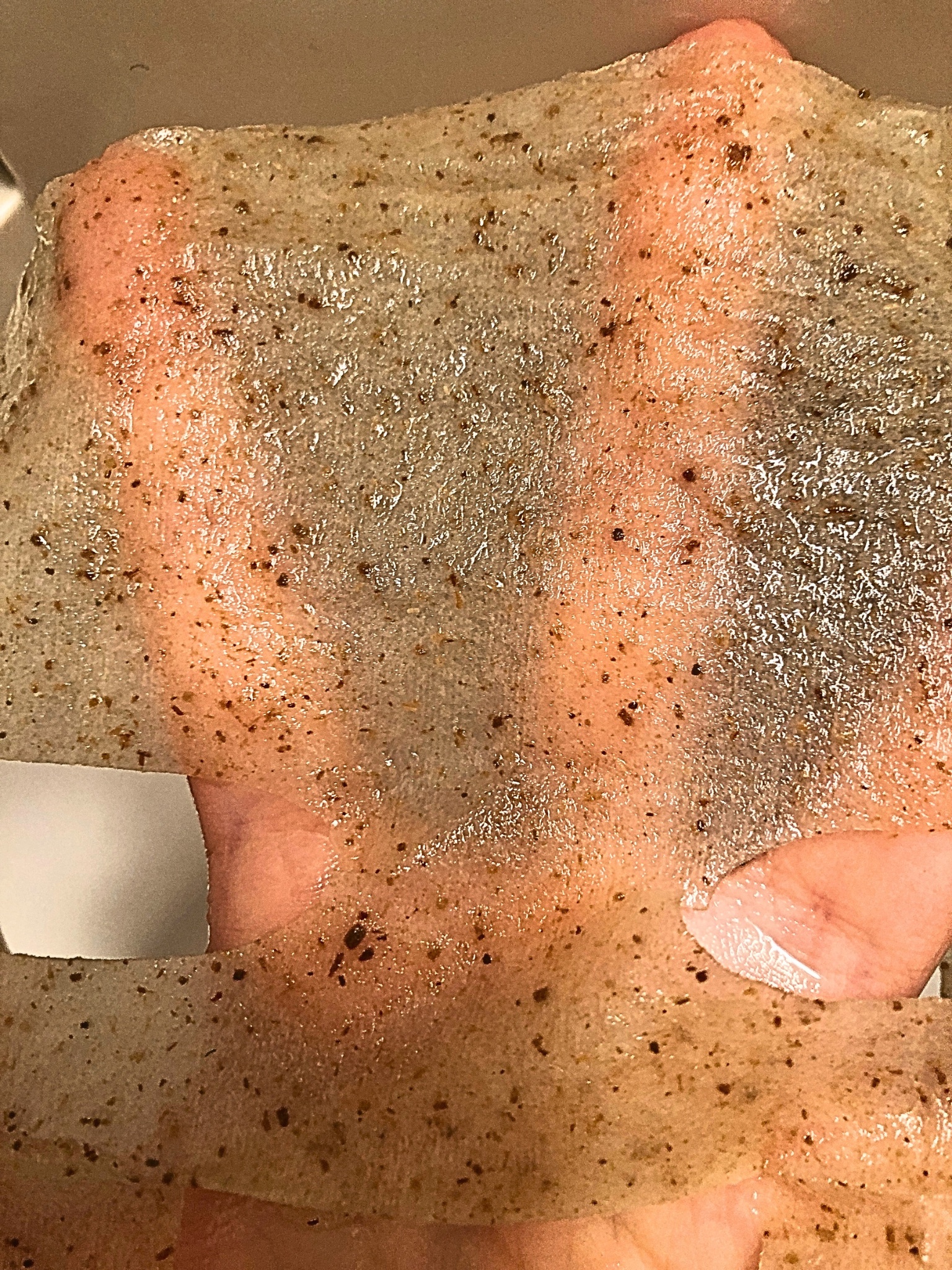 シャバシャバの液で清涼感のあるマスク。 肌を冷やしてくれるのでメイク前にもおすすめ。 開けた瞬間特徴的なシートにびっくり🙂 練り込まれた粒はなんとヨモギのすりおろし。 普通のシートよりしっかりした素材なので顔のパーツの凹凸からは浮き気味に感じる。