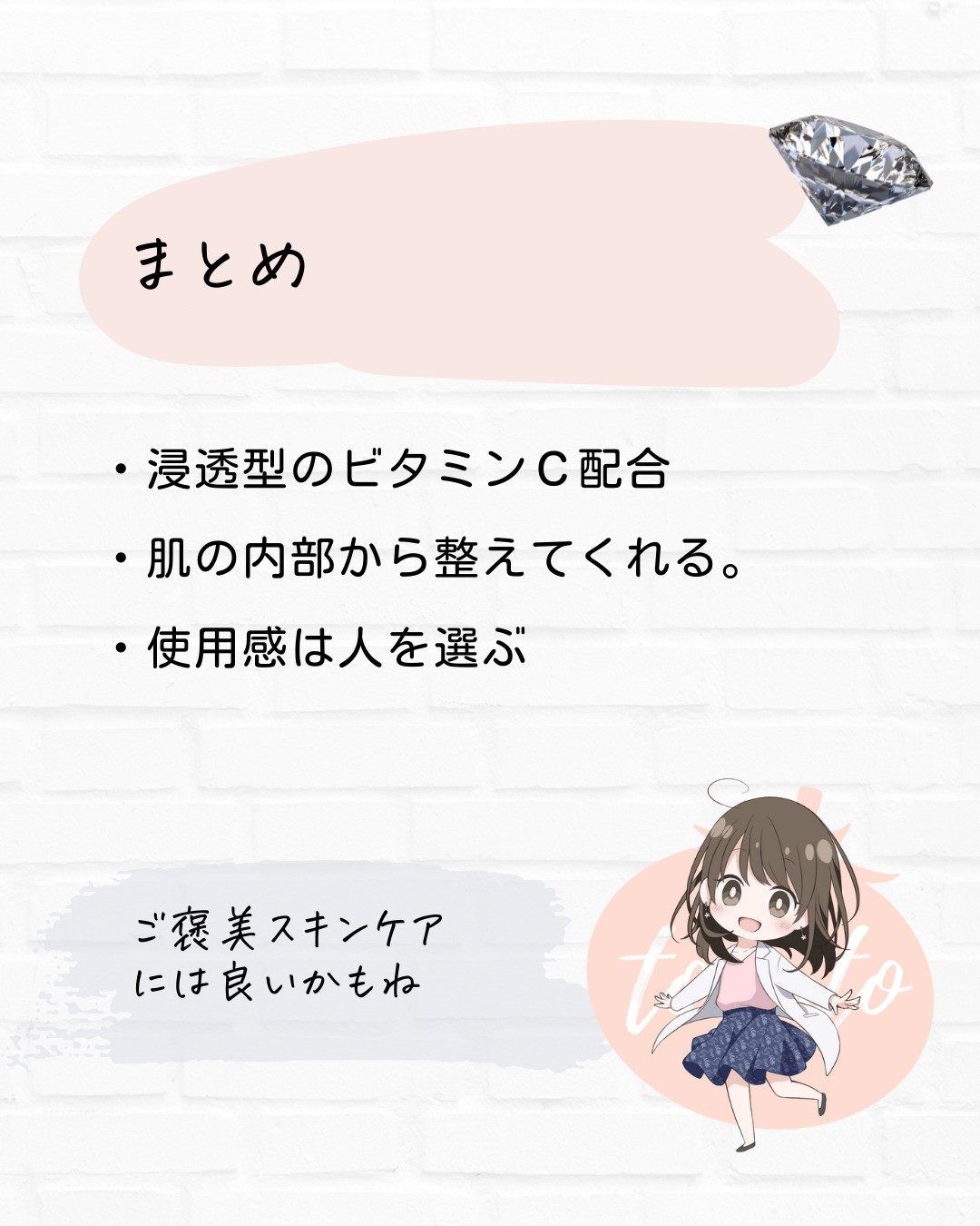 肌が荒れた時にビタミンCがいいとSNSで見かけたというフォロワーさんがいたけど、これは本当に辞めてほしい(濃度にもよるけど) ビタミンCは攻めのケアでもあるから、肌が敏感な時には避けてほしい。 でも、メラニン予防とか毛穴ケアには本当に良い商品でもあると思うから、使い方を間違えずに選択してほしいな!!