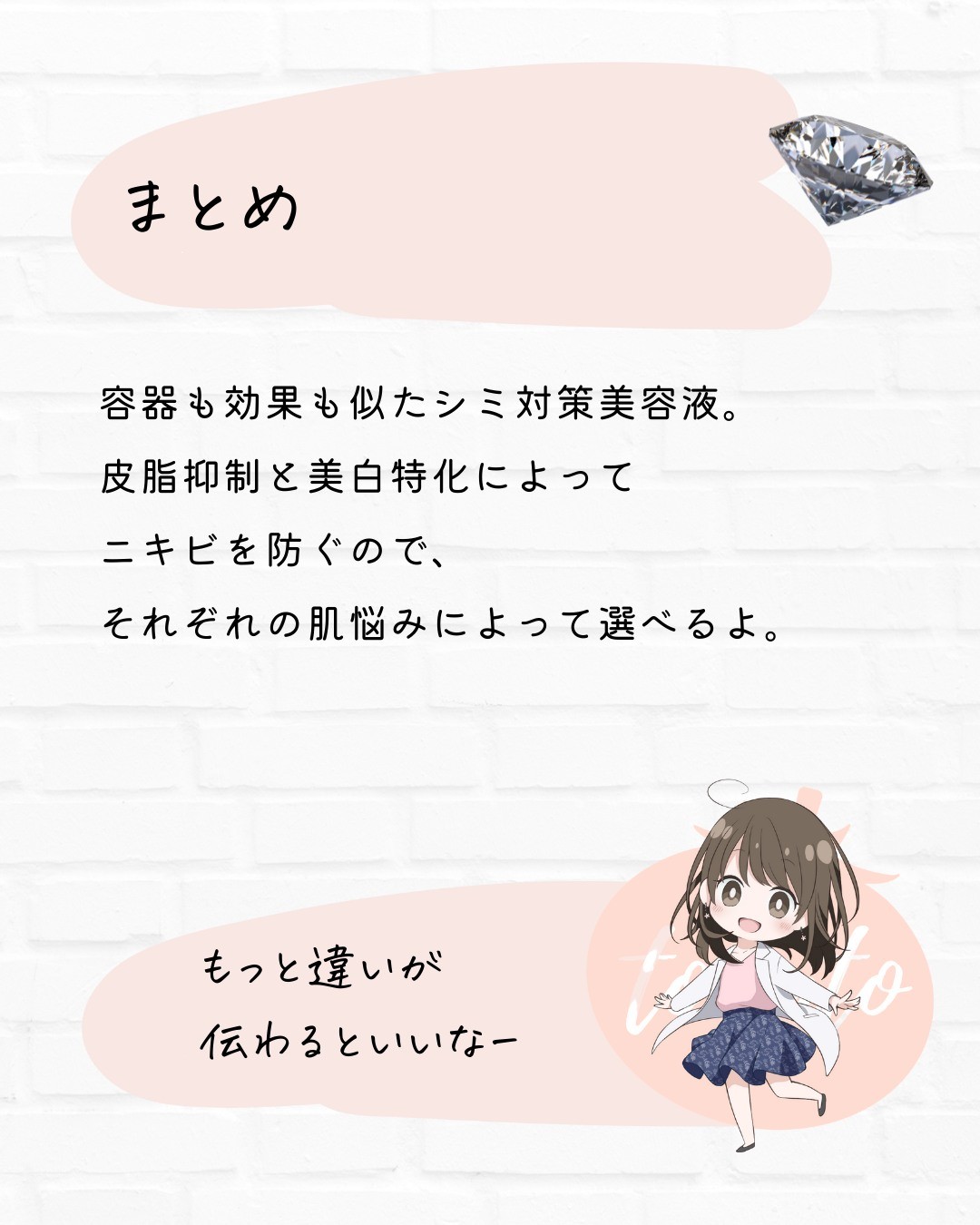 特定の有効成分を試してみたい。美容成分を試したい。そんな時は代用してもいいけど、それって似てるのかな?って思うときが正直ある。 同じ成分があっても実は濃度が違ったり、処方技術が違ったり。技術が違うと使用感も剤型も変わることがあることは知ったうえで使うといいかも。 せっかくプチプラ化粧品を買うならそれはそれで楽しんでほしいから是非念頭にいれてほしいな!!