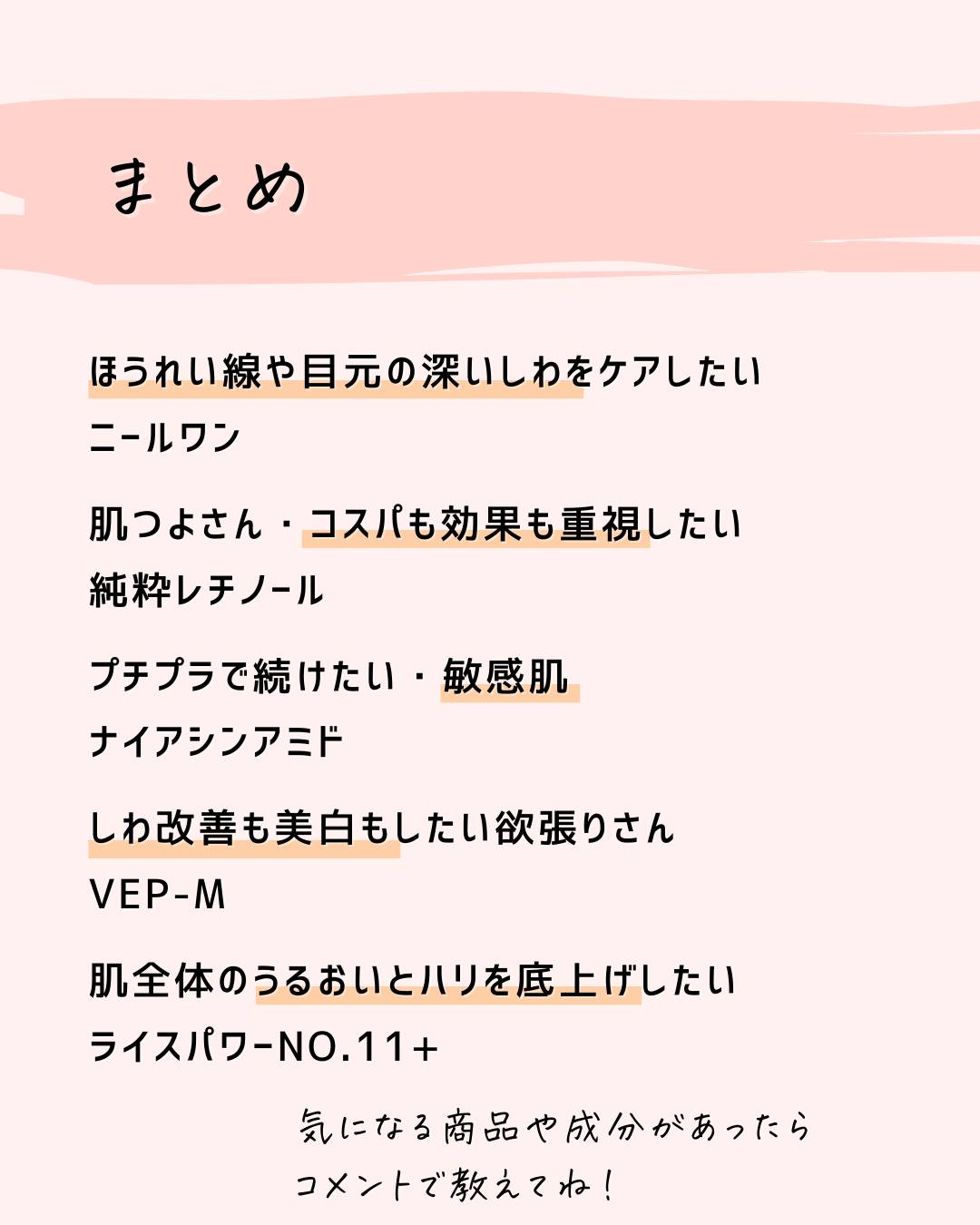 特定の有効成分を試してみたい。美容成分を試したい。そんな時は代用してもいいけど、それって似てるのかな?って思うときが正直ある。 同じ成分があっても実は濃度が違ったり、処方技術が違ったり。技術が違うと使用感も剤型も変わることがあることは知ったうえで使うといいかも。 せっかくプチプラ化粧品を買うならそれはそれで楽しんでほしいから是非念頭にいれてほしいな!!