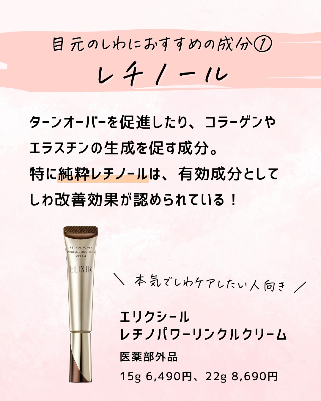 愛用&リピートしているアイクリーム✨◇エリクシールレチノパワーリンクルクリームなめらかな使い心地でのびが良くべたつきにくいのに高保湿なクリームです。レチノール類で日本で唯一、シワを改善する純粋レチノール*を配合で本格的に目元ケアをしたい方にお...