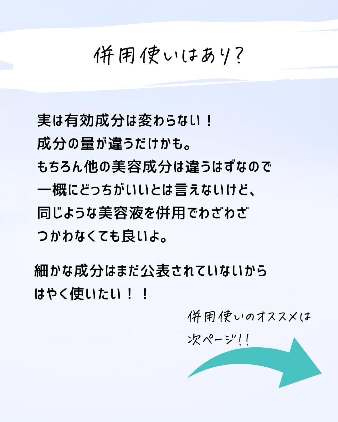 特定の有効成分を試してみたい。美容成分を試したい。そんな時は代用してもいいけど、それって似てるのかな?って思うときが正直ある。 同じ成分があっても実は濃度が違ったり、処方技術が違ったり。技術が違うと使用感も剤型も変わることがあることは知ったうえで使うといいかも。 せっかくプチプラ化粧品を買うならそれはそれで楽しんでほしいから是非念頭にいれてほしいな!!