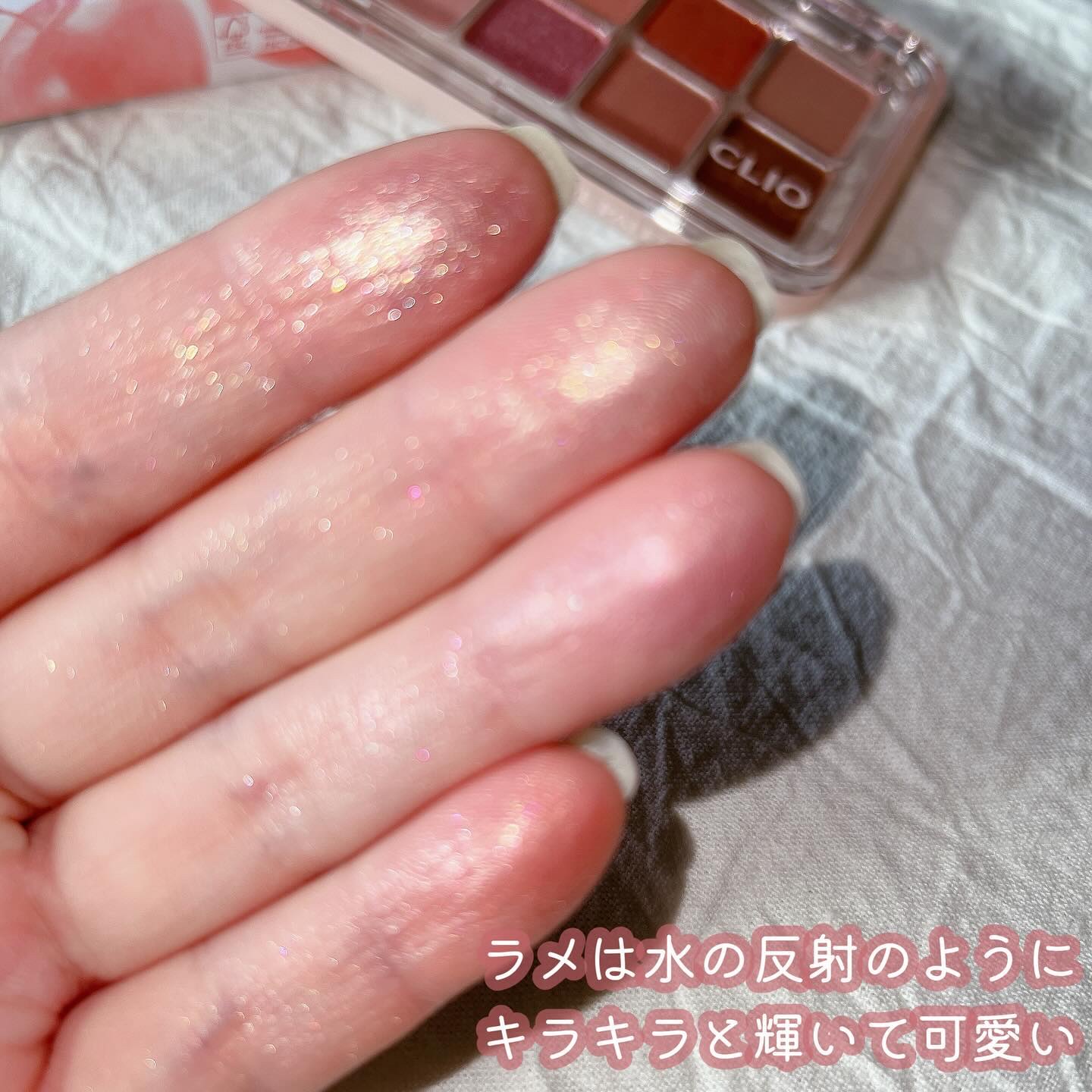 11 ショッピングチーズ イエベ向き?と思いきや、ピンクベージュ寄りだから誰でも使えそうな雰囲気🧡 下段はブラウン系カラーが揃っているのでデイリーとオフ時のメイクにピッタリ 12 クリスタルポー ブルベ大優勝系パレット🏆 青みのあるグリッターやオーロラシマーカラーなど 涼やかなのに可愛さのある色合いでどのシーズンでも使えそう🩷 粉質はしっとり グリッターやシマーカラーもしっとりしてるからラメ飛びが少ないし、濡れツヤ感が出る✨