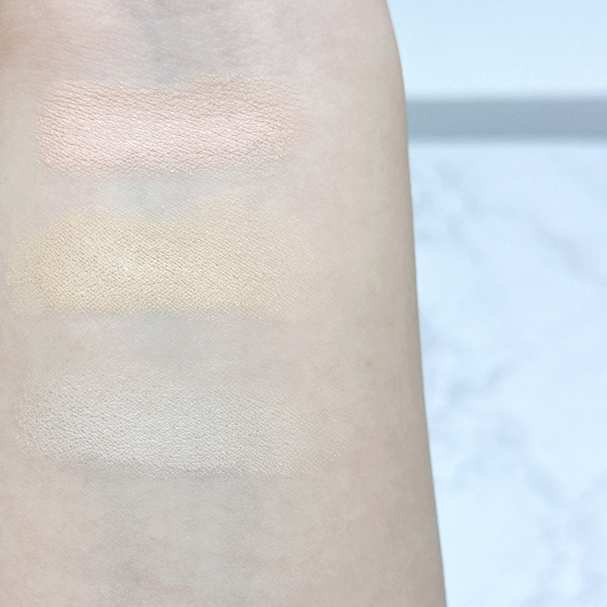 肌トーンの補正に集中したカラーコレクティング。透明感ある3色のカラーで、クマにはピンク、明るさを足したいところにホワイト、くすみが気になるところにパープルを使用☝️ 指でトントンつけるだけだからテクニックいらずに肌の悩みをカバーしてくれる🫶 リキッドタイプを圧縮しあ高濃度バームだから高密着で、マスクしててもヨレにくいところが◎!