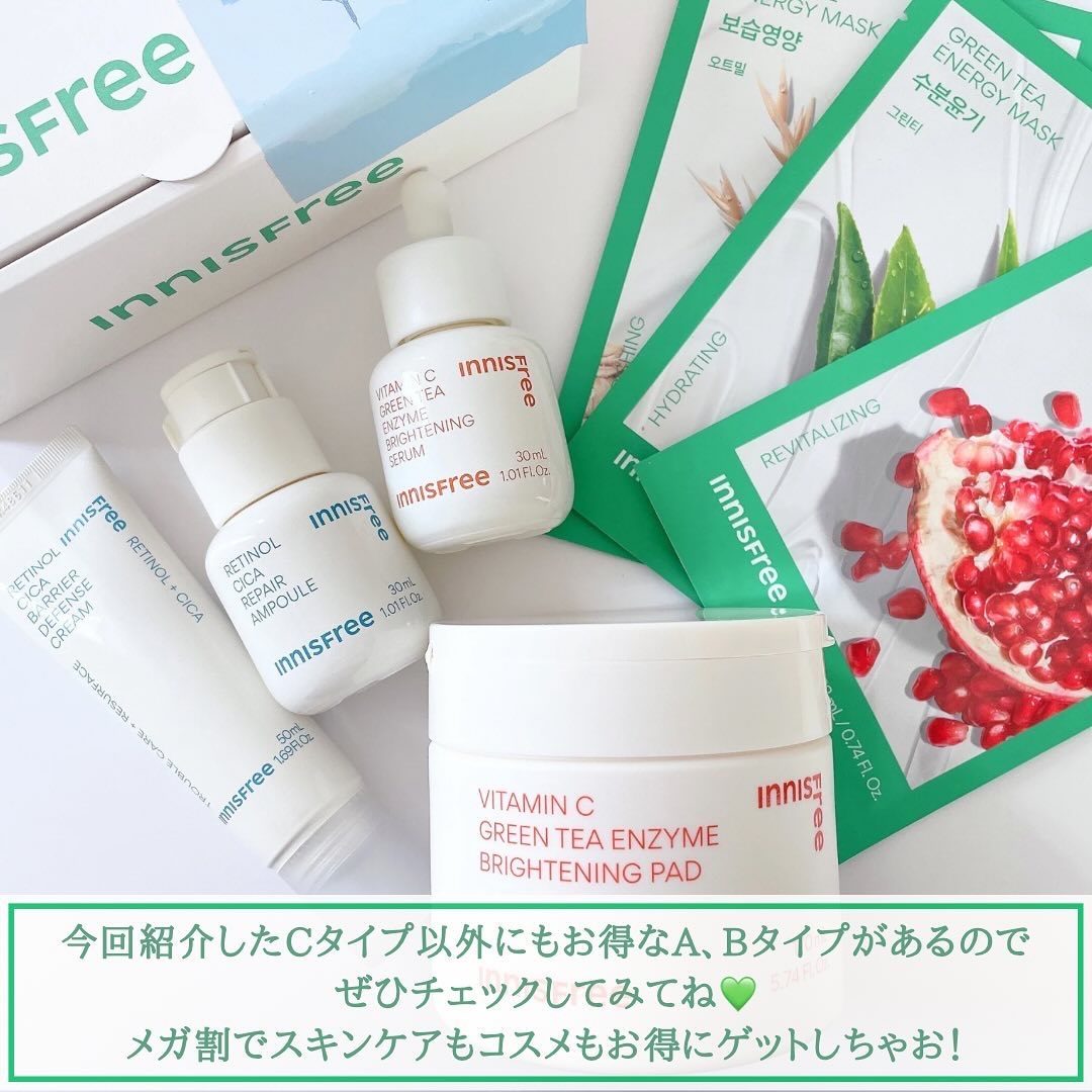 Qoo10メガ割りイニスフリー秋の集中スキンケアセット朝ビタ夜レチ・レチノールPDRNアドバンスドセラム 25ml・ビタCグリーンティーエンザイムブライトセラム30ml・ビタCグリーンティーエンザイムブライトマスク5枚がセットになったものです...