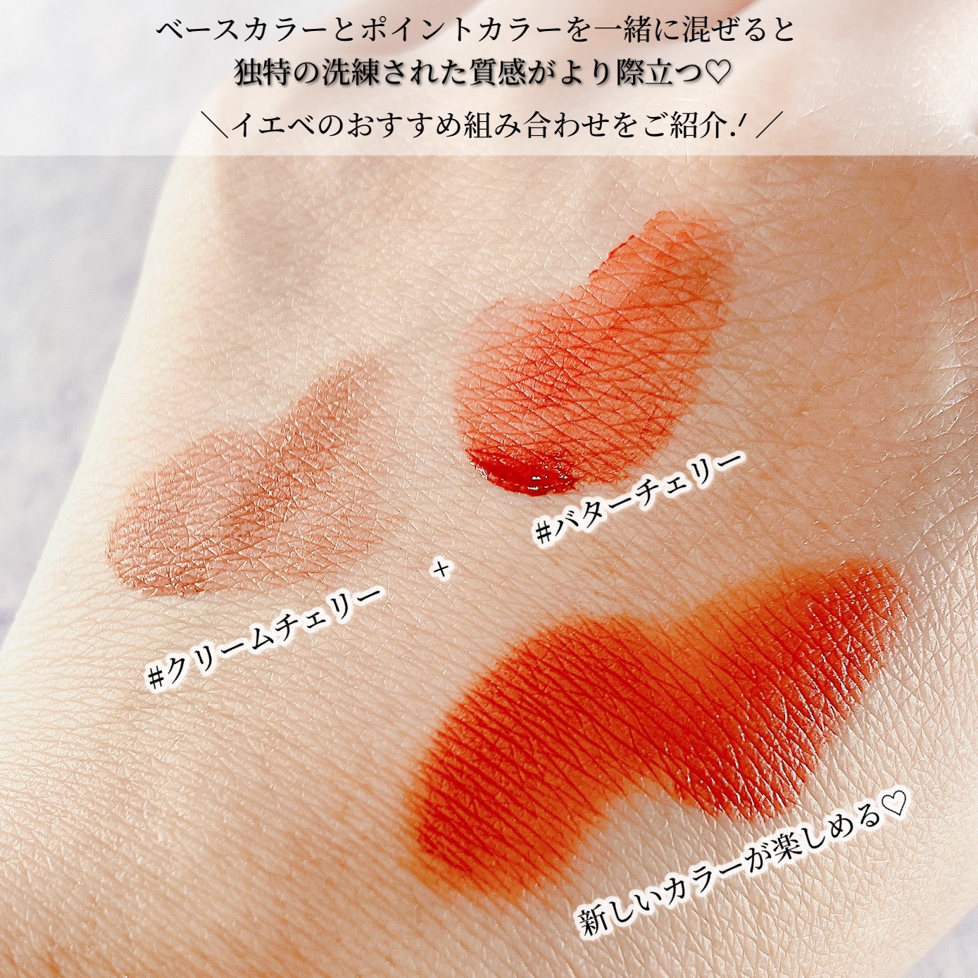 - <ウィンターピンク> ダイメジメチコン、イソドデカン、合成フルオロフロゴパイト、(ジメチコン/ビニルジメチコン)クロスポリマー、トリイソステアリン酸ポリグリセリル-2、ポリイソブテン、トリメチルシロキシケイ酸、シリカ、二酸化チタン、1,2-ヘキサンジオール、赤色201号、黄色4号、黄色酸化鉄、ビニルジメチコン/メチコンシルセスキオキサン)クロスポリマー、黒色酸化鉄、赤色104号(1)、エチルヘキシルグリセリン、精製水 <モーブチェリー> ダイメジメチコン、イソドデカン、合成フルオロフロゴパイト、(ジメチコン/ビニルジメチコン)クロスポリマー、トリイソステアリン酸ポリグリセリル-2、ポリイソブテン、トリメチルシロキシケイ酸、二酸化チタン、シリカ、1,2-ヘキサンジオール、赤色202号、黄色酸化鉄、ビニルジメチコン/メチコンシルセスキオキサン)クロスポリマー、黒色酸化鉄、赤色酸化鉄、赤色104号(1)、エチルヘキシルグリセリン、精製水 <ミュートチェリー> ダイメジメチコン、イソドデカン、合成フルオロフロゴパイト、(ジメチコン/ビニルジメチコン)クロスポリマー、トリイソステアリン酸ポリグリセリル-2、ポリイソブテン、トリメチルシロキシケイ酸、二酸化チタン、シリカ、黄色酸化鉄、1,2-ヘキサンジオール、ビニルジメチコン/メチコンシルセスキオキサン)クロスポリマー、赤色酸化鉄、黒色酸化鉄、赤色202号、エチルヘキシルグリセリン、精製水 <ベリーチェリー> ダイメジメチコン、イソドデカン、合成フルオロフロゴパイト、(ジメチコン/ビニルジメチコン)クロスポリマー、トリイソステアリン酸ポリグリセリル-2、ポリイソブテン、トリメチルシロキシケイ酸、シリカ、酸化チタン、赤色酸化鉄、黄色4号、1,2-ヘキサンジオール、赤色202号、ビニルジメチコン/メチコンシルセスキオキサン)クロスポリマー、黒色酸化鉄、エチルヘキシルグリセリン、精製水 <クリームチェリー> ダイメジメチコン、イソドデカン、合成フルオロフロゴパイト、(ジメチコン/ビニルジメチコン)クロスポリマー、トリイソステアリン酸ポリグリセリル-2、ポリイソブテン、トリメチルシロキシケイ酸、二酸化チタン、シリカ、1,2-ヘキサンジオール、黄色酸化鉄、赤色104号(1)、ビニルジメチコン/メチコンシルセスキオキサン)クロスポリマー、赤色酸化鉄、黒色酸化鉄、エチルヘキシルグリセリン、精製水 <バターチェリー> ダイメジメチコン、イソドデカン、合成フルオロフロゴパイト、(ジメチコン/ビニルジメチコン)クロスポリマー、トリイソステアリン酸ポリグリセリル-2、ポリイソブテン、トリメチルシロキシケイ酸、二酸化チタン、シリカ、赤色酸化鉄、1,2-ヘキサンジオール、黄色酸化鉄、ビニルジメチコン/メチコンシルセスキオキサン)クロスポリマー、黒色酸化鉄、赤色202号、黄色4号、エチルヘキシルグリセリン、精製水 <リアルチェリー> ダイメジメチコン、イソドデカン、合成フルオロフロゴパイト、(ジメチコン/ビニルジメチコン)クロスポリマー、赤色40号、トリイソステアリン酸ポリグリセリル-2、ポリイソブテン、トリメチルシロキシケイ酸、赤色227号、シリカ、1,2-ヘキサンジオール、ビニルジメチコン/メチコンシルセスキオキサン)クロスポリマー、赤色酸化鉄、エチルヘキシルグリセリン、香料 <ブリックチェリー> ダイメジメチコン、イソドデカン、合成フルオロフロゴパイト、(ジメチコン/ビニルジメチコン)クロスポリマー、赤色40号、トリイソステアリン酸ポリグリセリル-2、ポリイソブテン、トリメチルシロキシケイ酸、赤色227号、シリカ、1,2-ヘキサンジオール、ビニルジメチコン/メチコンシルセスキオキサン)クロスポリマー、赤色酸化鉄、エチルヘキシルグリセリン、香料