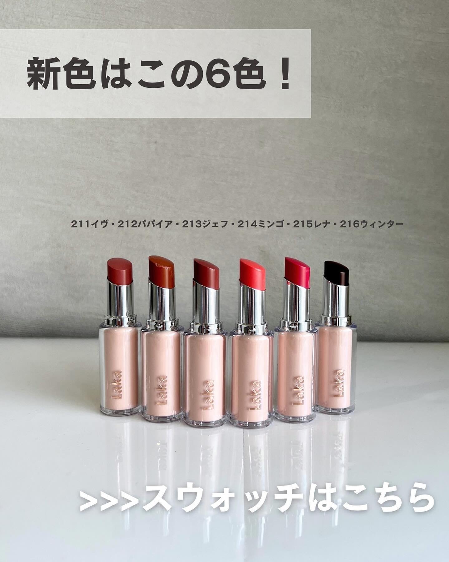 - Point1 透き通った気品が感じられるカラー ユニークなヌードカラーから自然なニュートラルカラー、深くて密度のあるポイントカラーまで、さまざまな好みに合わせた幅広いカラーバリエーション。それぞれのカラーが持つ明度や彩度に合わせて透明感を細かく調整しているため、グラデーションリップやオーバリップなど、プロが施したようなさまざまなリップメイクが楽しめます。また、夕方の暗い空間や、室内の光の下でも、唇本来の色にリップスティックのカラーが馴染み、水彩画のようなナチュラルな発色で、自然な血色感のある唇に演出します。 Point2 光に包まれたガラス玉のようなきらめき Lakaならではの「ボンディンググロウ」フォーミュラで、唇に触れた瞬間、体温でやさしく溶けていくようなテクスチャー。しっとりと馴染んで密着しながら唇をコーティングしてくれます。高い屈折率で光を強く反射させるハイシャインオイルコンプレックスを配合し、光沢感のある生き生きとしたリップカラーを実現しました。