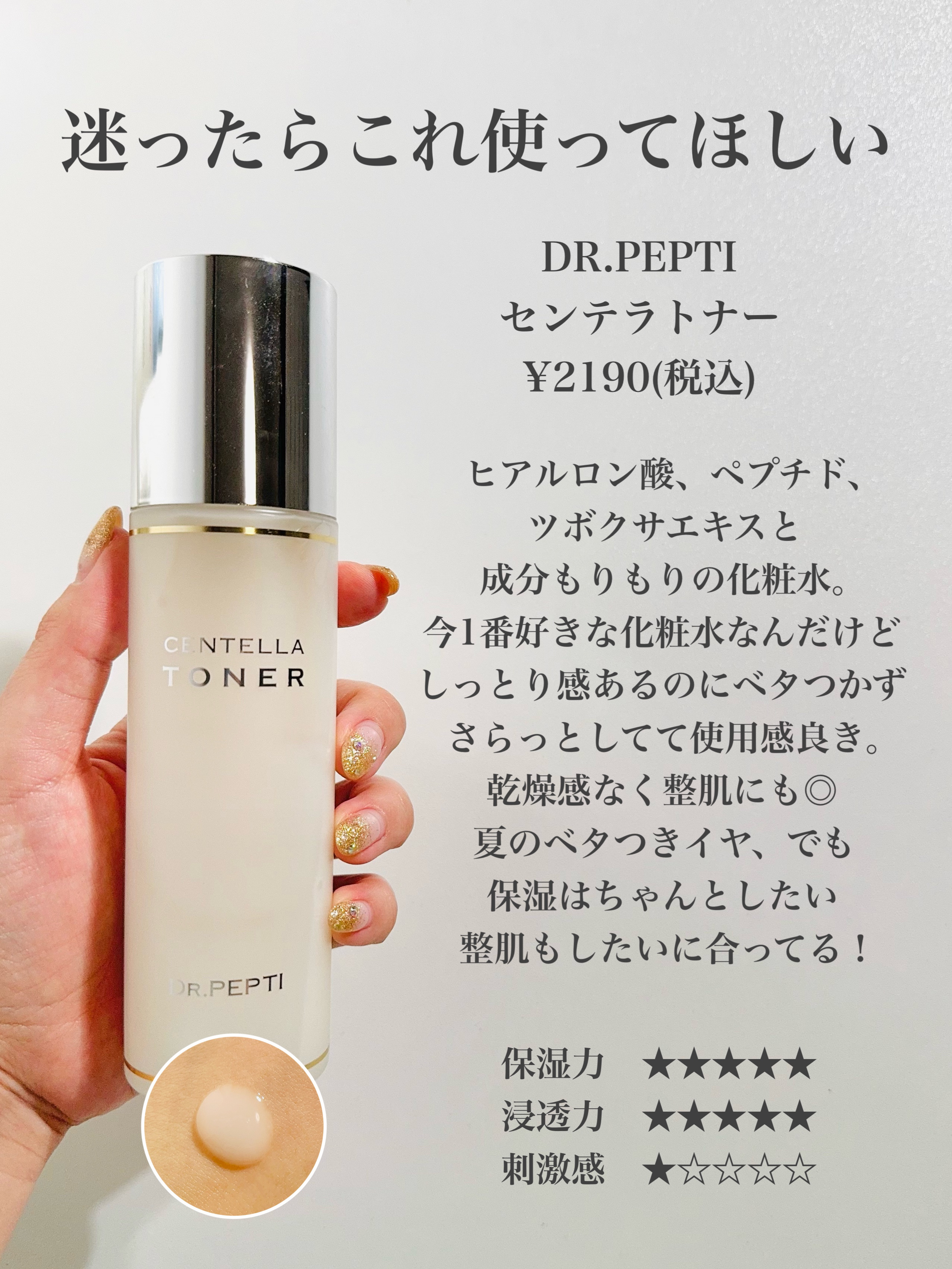 ドクターぺプチ センテラトナーEX180ml◼︎POINT1ツボクサエキス高配合で肌を鎮静させてくれます。◼︎POINT2ペプチド5種配合で肌を整えハリ感を与えてくれます。◼︎POINT3複合ヒアルロン酸8種で肌に潤いと保湿成分を補給してくれ...